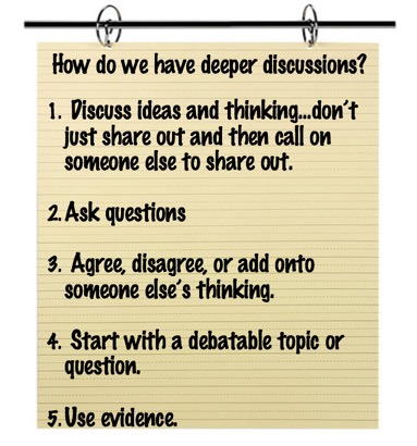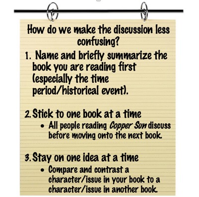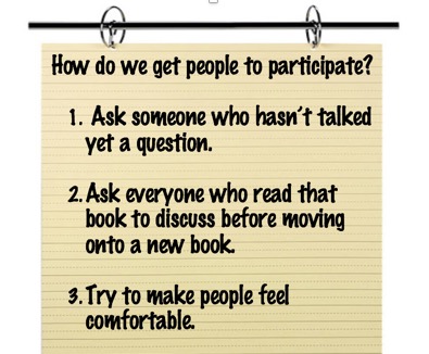 Diane wished she had shown a video of a class doing a spider web discussion (as we had seen ourselves when learning about them) before jumping in. We decided instead to have the next discussion as a fishbowl. In the center circle we will have all the students reading the books that go along with the holocaust. On the outside will be the students who are reading books on the other topics. They will make a web as the inner circle reflects and pay attention as well for the various types of contributions or comments (process, opinion, evidence, clarify, disruption). Then after the discussion, the students in the outer circle will discuss what they noticed not only about the process, but also how the inner circle did with going deeper than just stating an opinion.