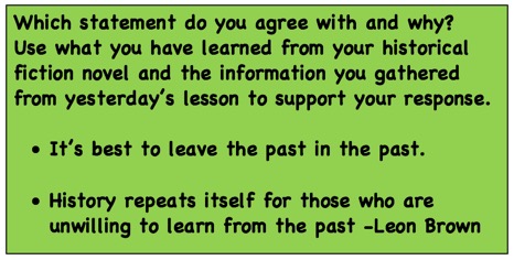 Diane decided to use choice in order to encourage some debate since students reflected that it might help. They were in the part of the historical fiction unit where the students were well into their book club books and had an opportunity to do some research into the causes for their topic (holocaust, slavery in America, civil rights, deportation and refugees, the American Revolution). On the day of the next discussion, Diane had students do a quick write with choices.