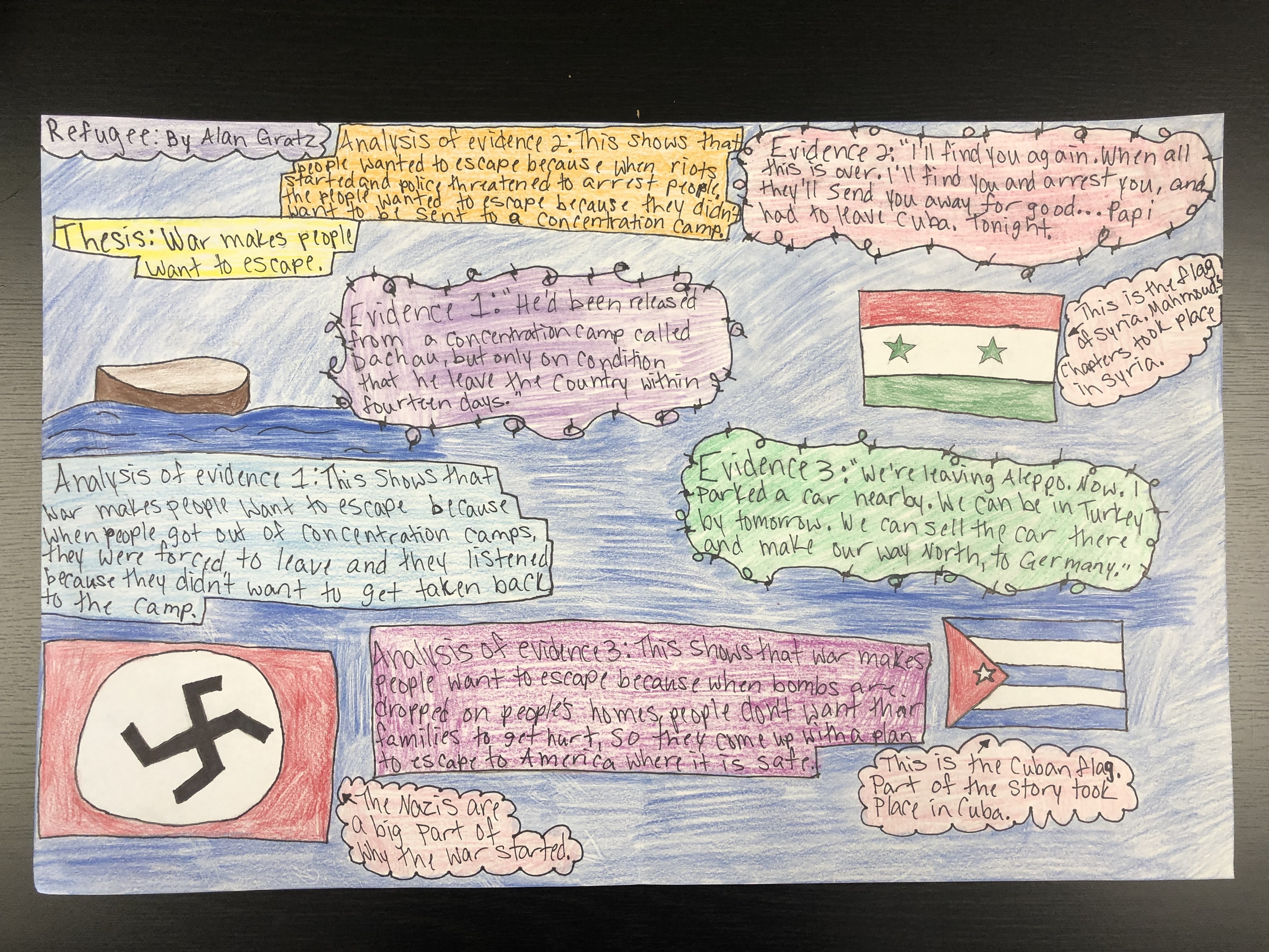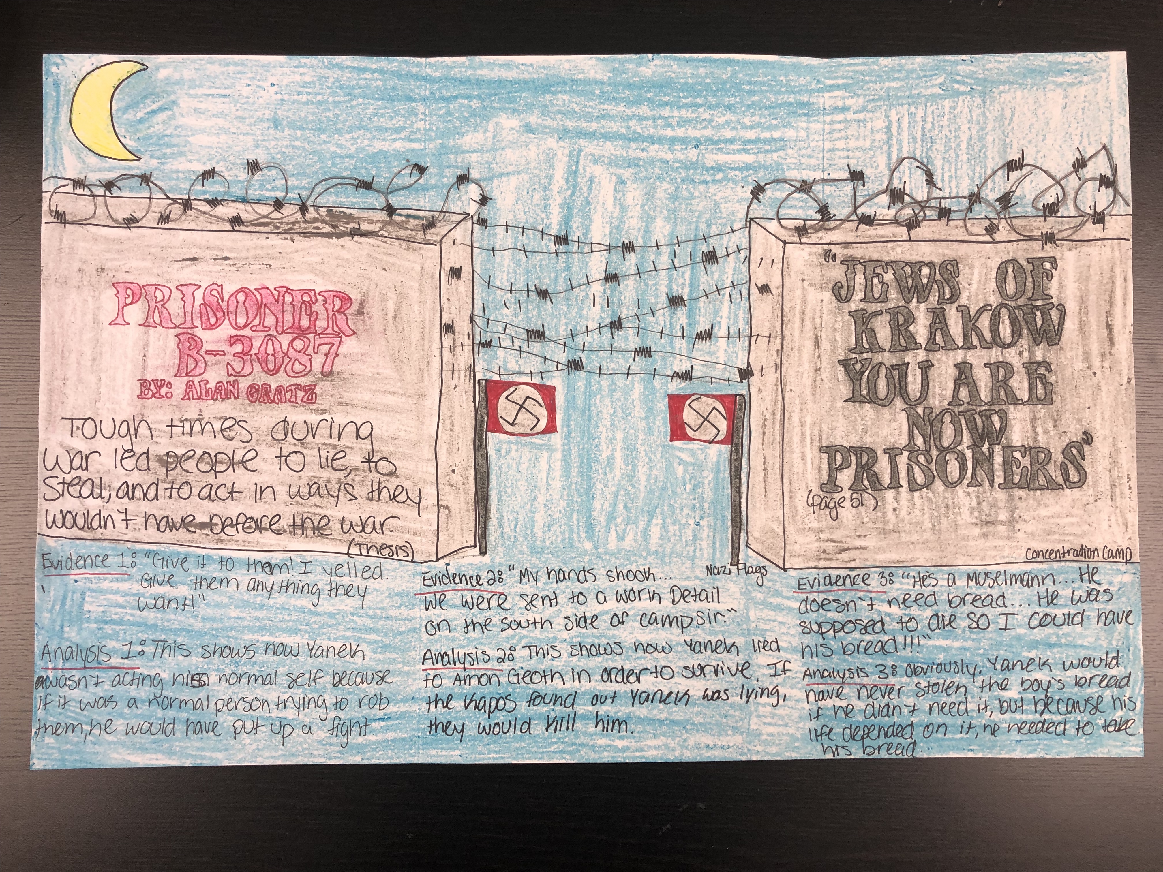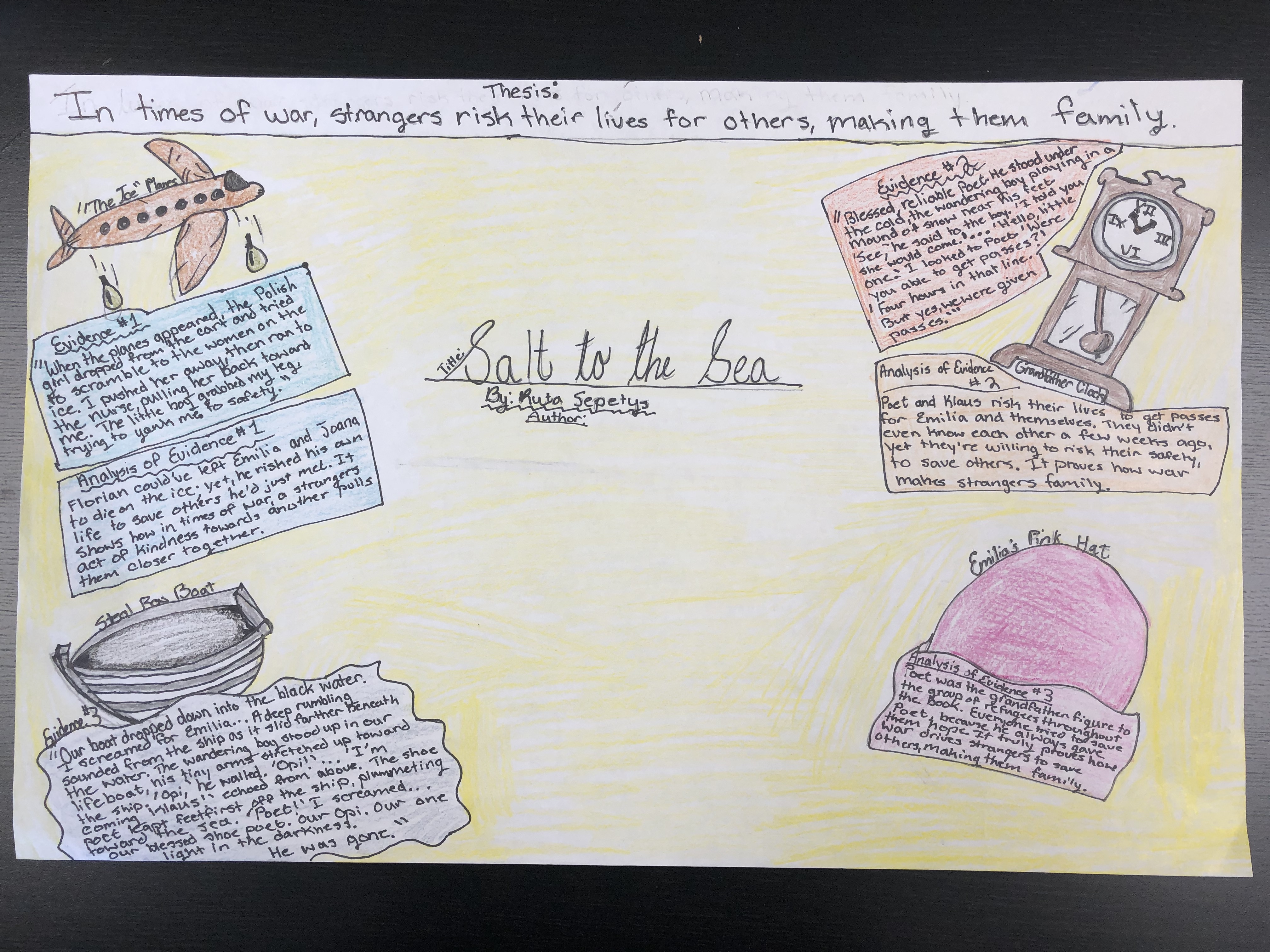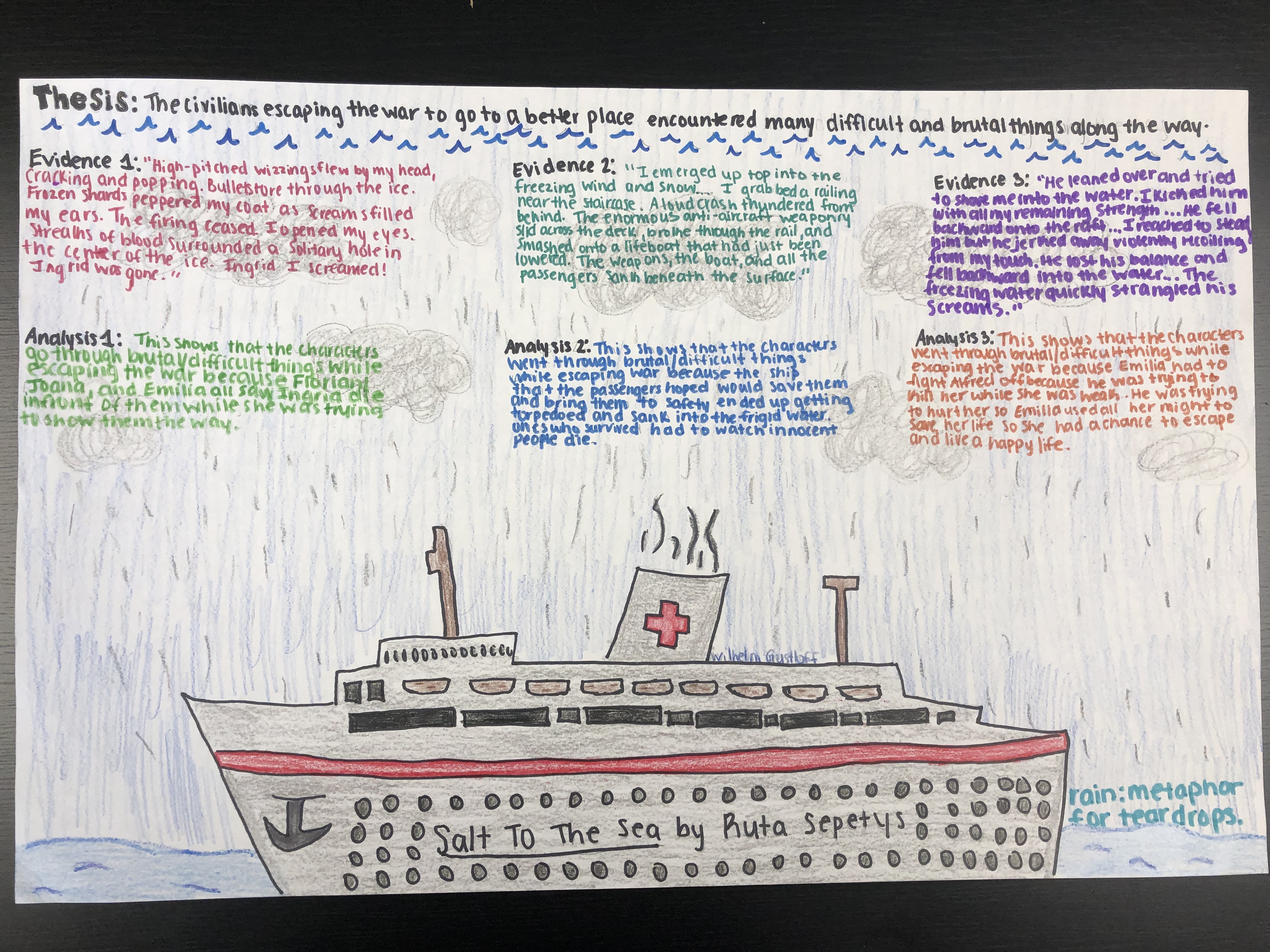 Danielle outlined the expectations (seen above) and provided time for students to organize their ideas before they began. The result? Beautiful graphic essays that included thematic statements (thesis), evidence to support the statements, and an analysis of each piece of evidence. She also challenged them to incorporate symbols that related to characters, setting, theme, or conflict.