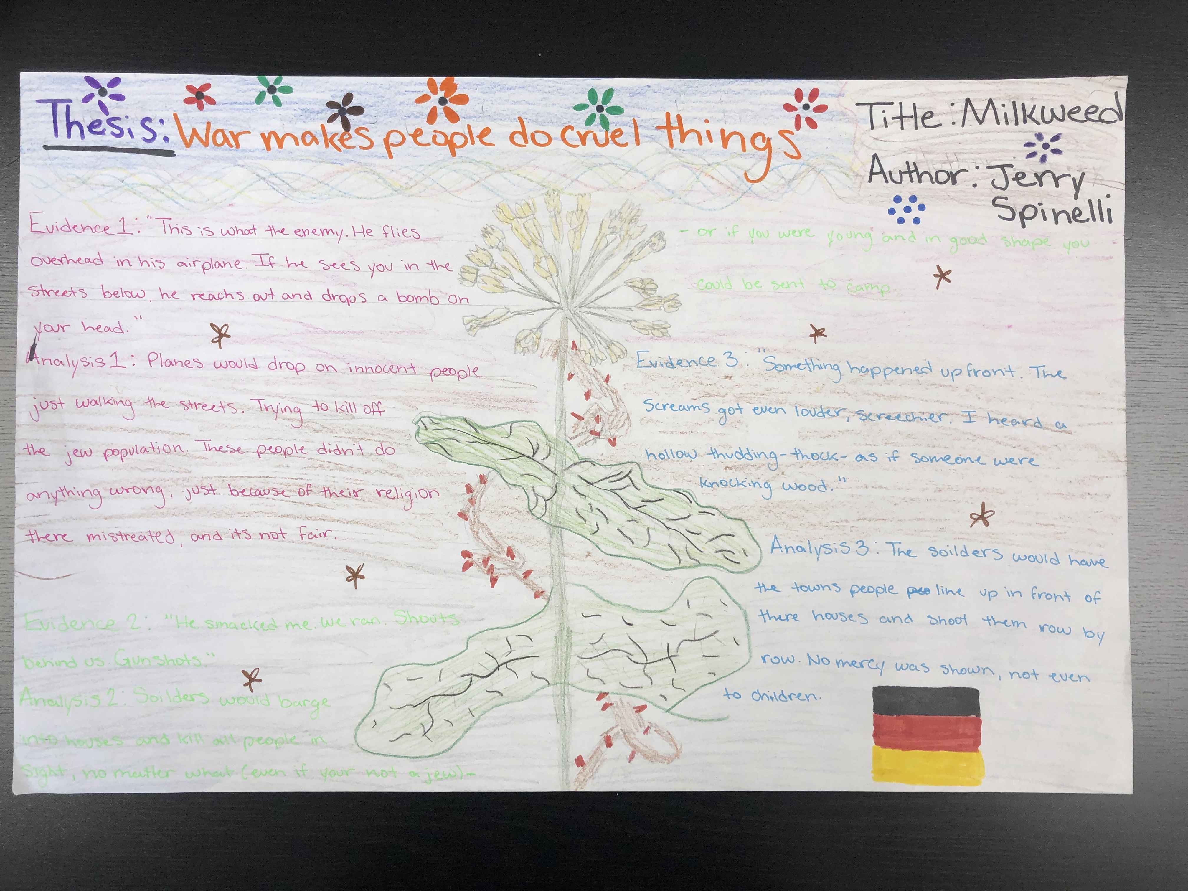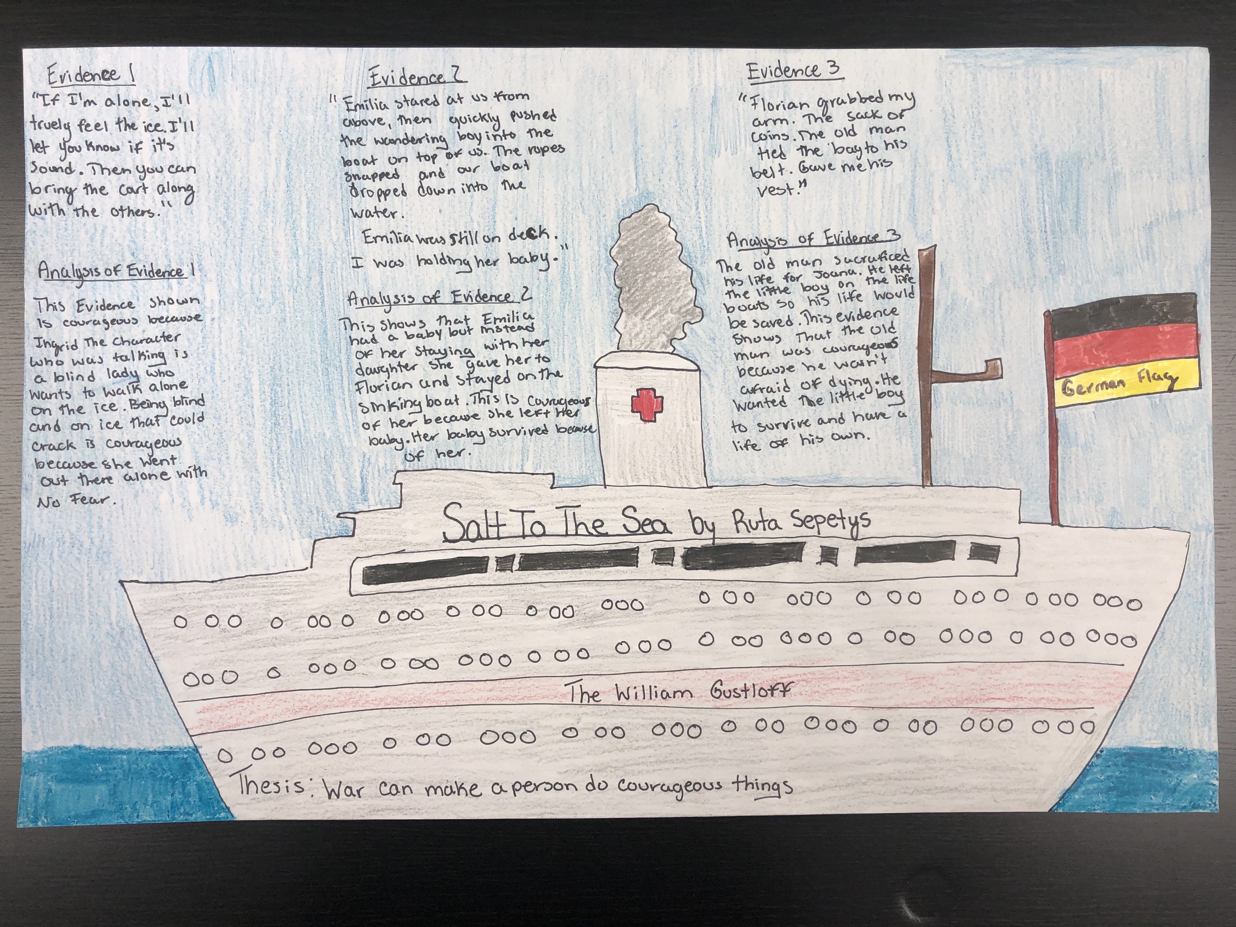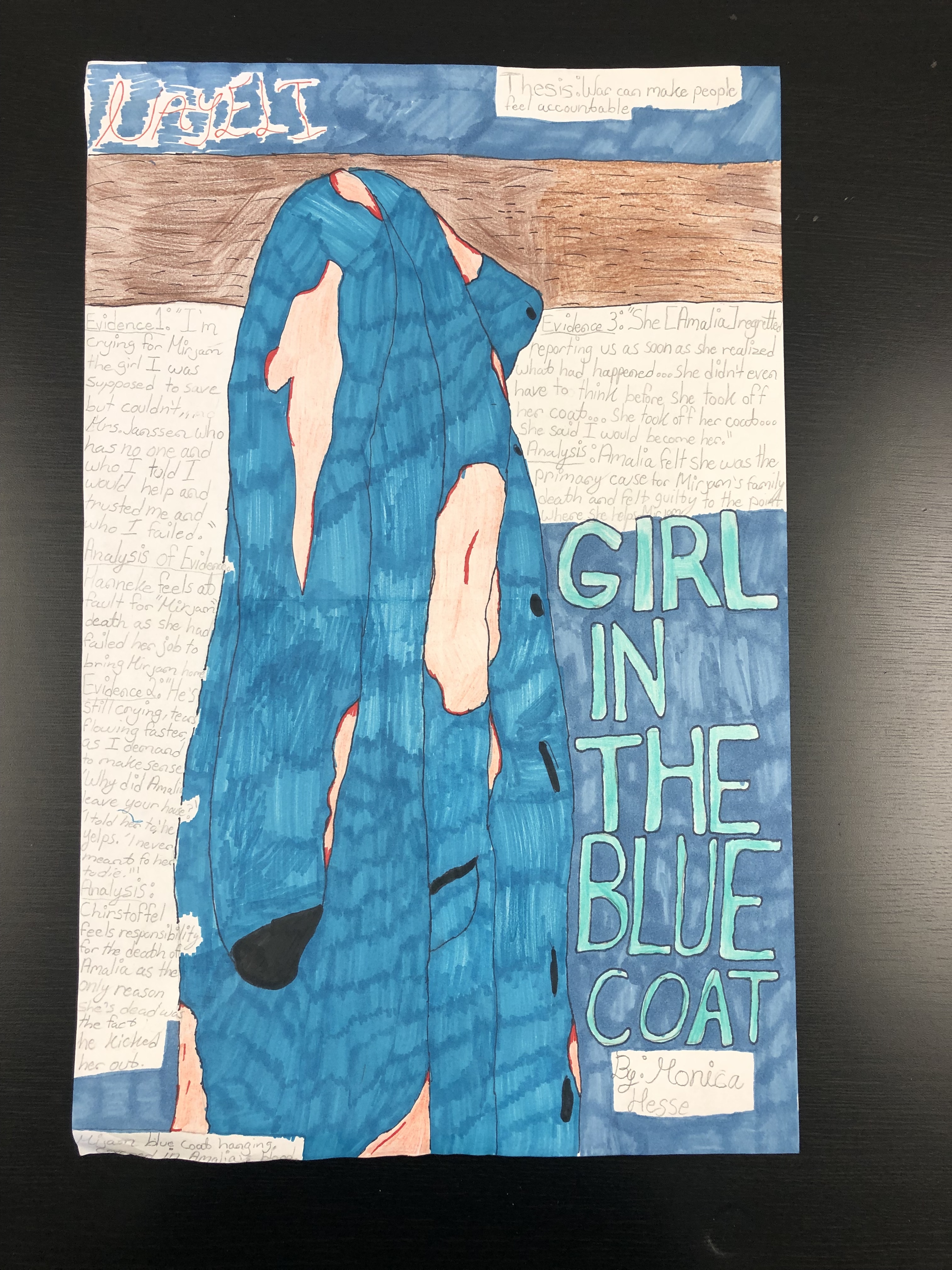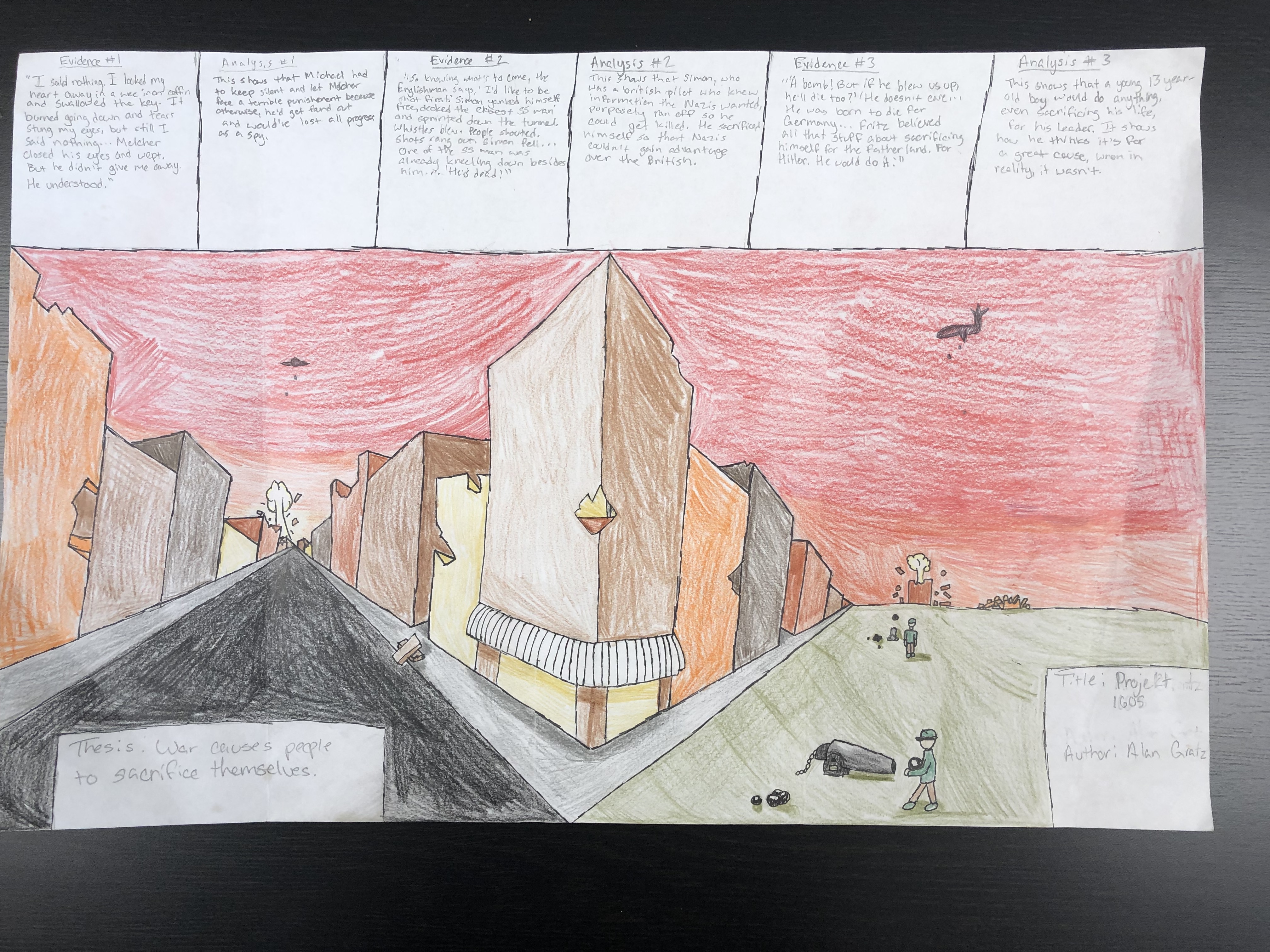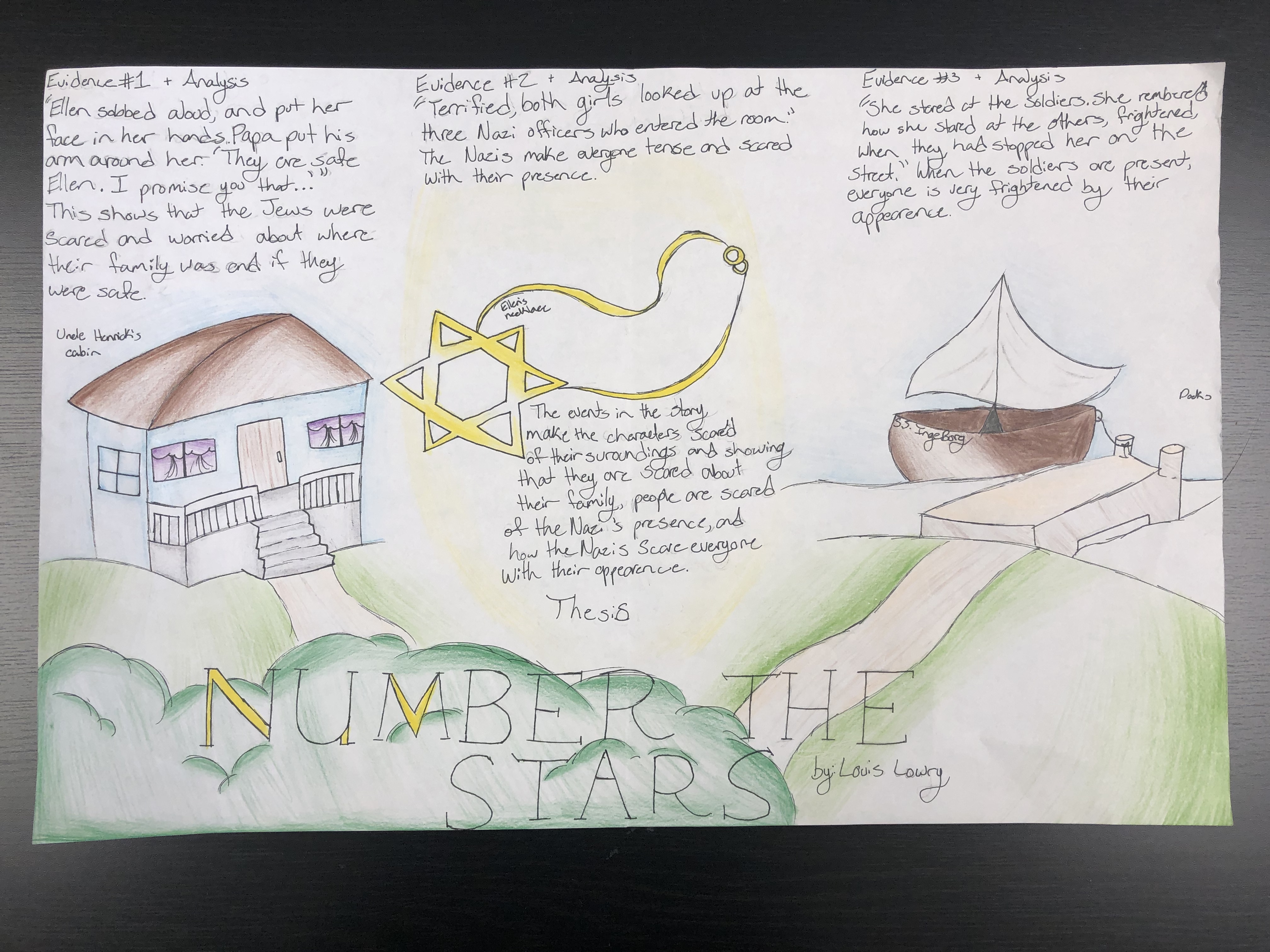 Danielle outlined the expectations (seen above) and provided time for students to organize their ideas before they began. The result? Beautiful graphic essays that included thematic statements (thesis), evidence to support the statements, and an analysis of each piece of evidence. She also challenged them to incorporate symbols that related to characters, setting, theme, or conflict.
