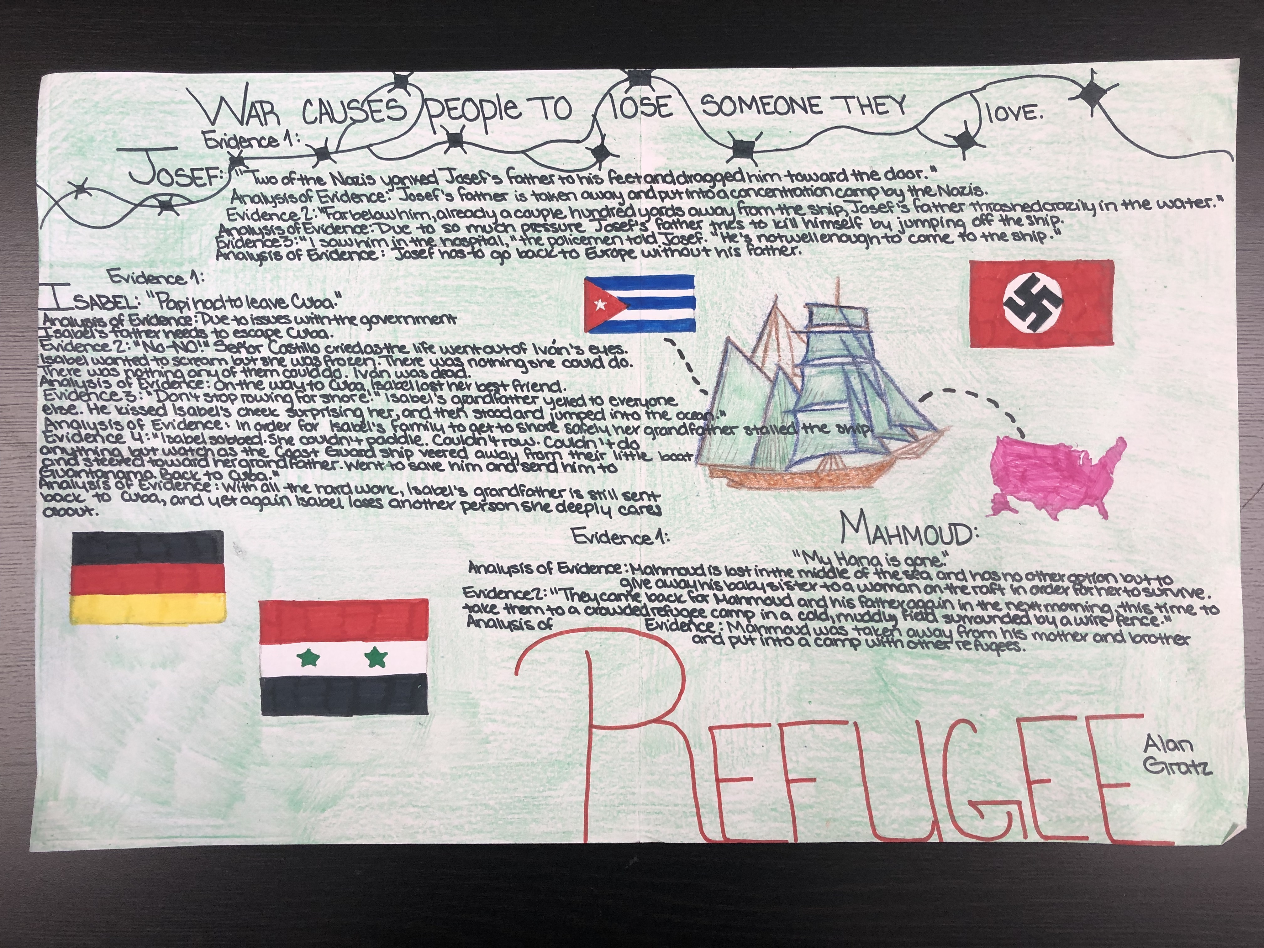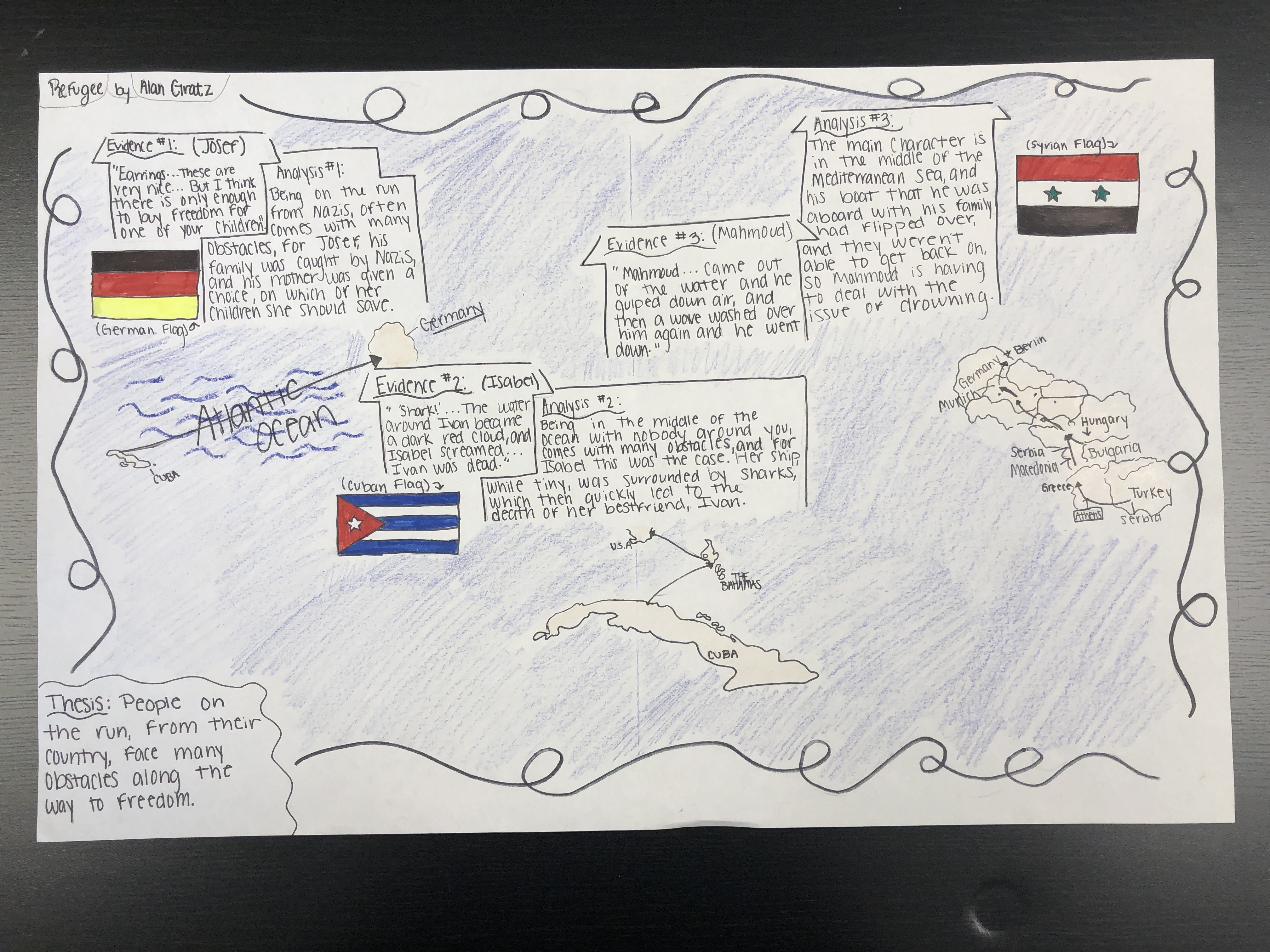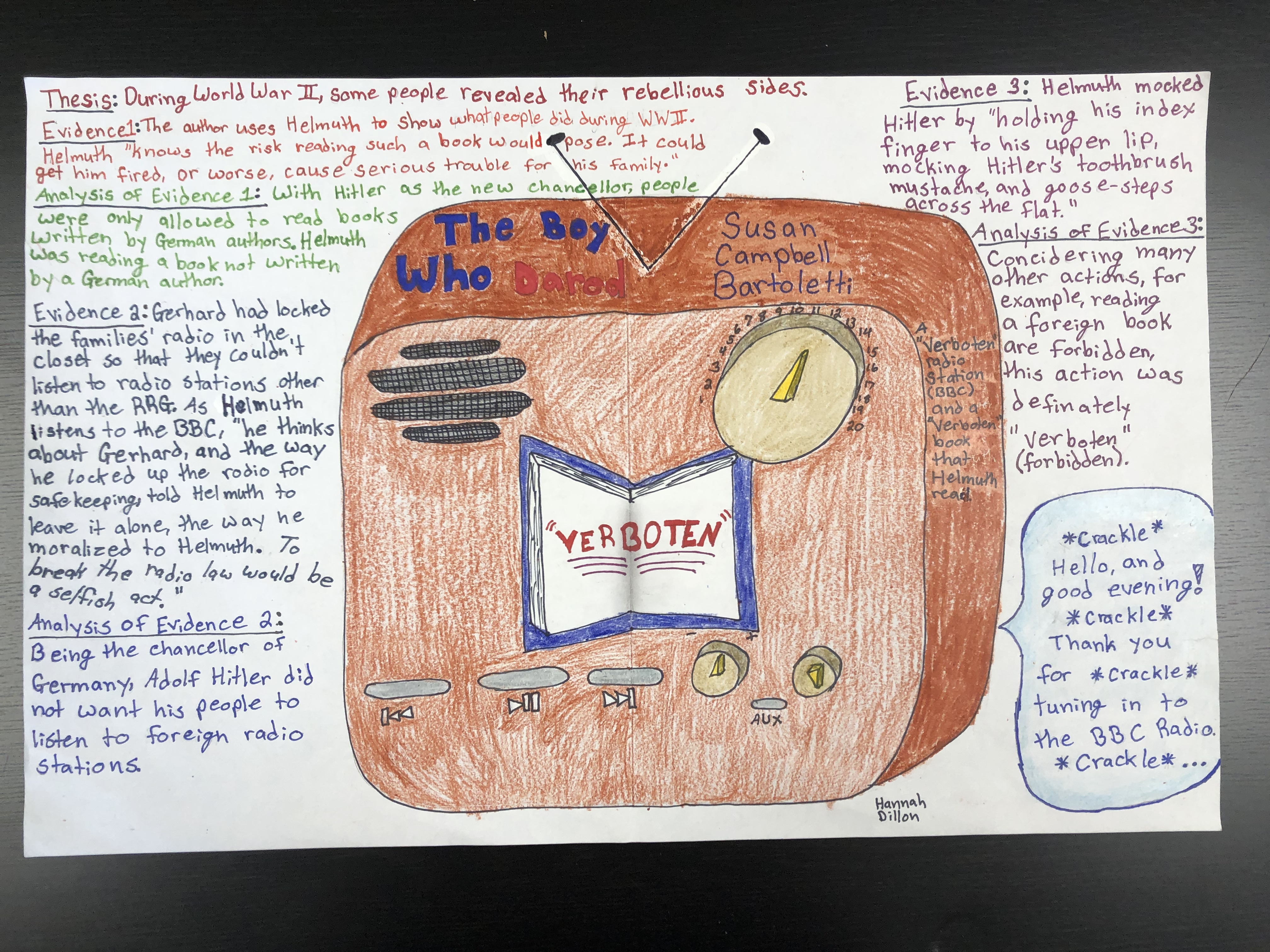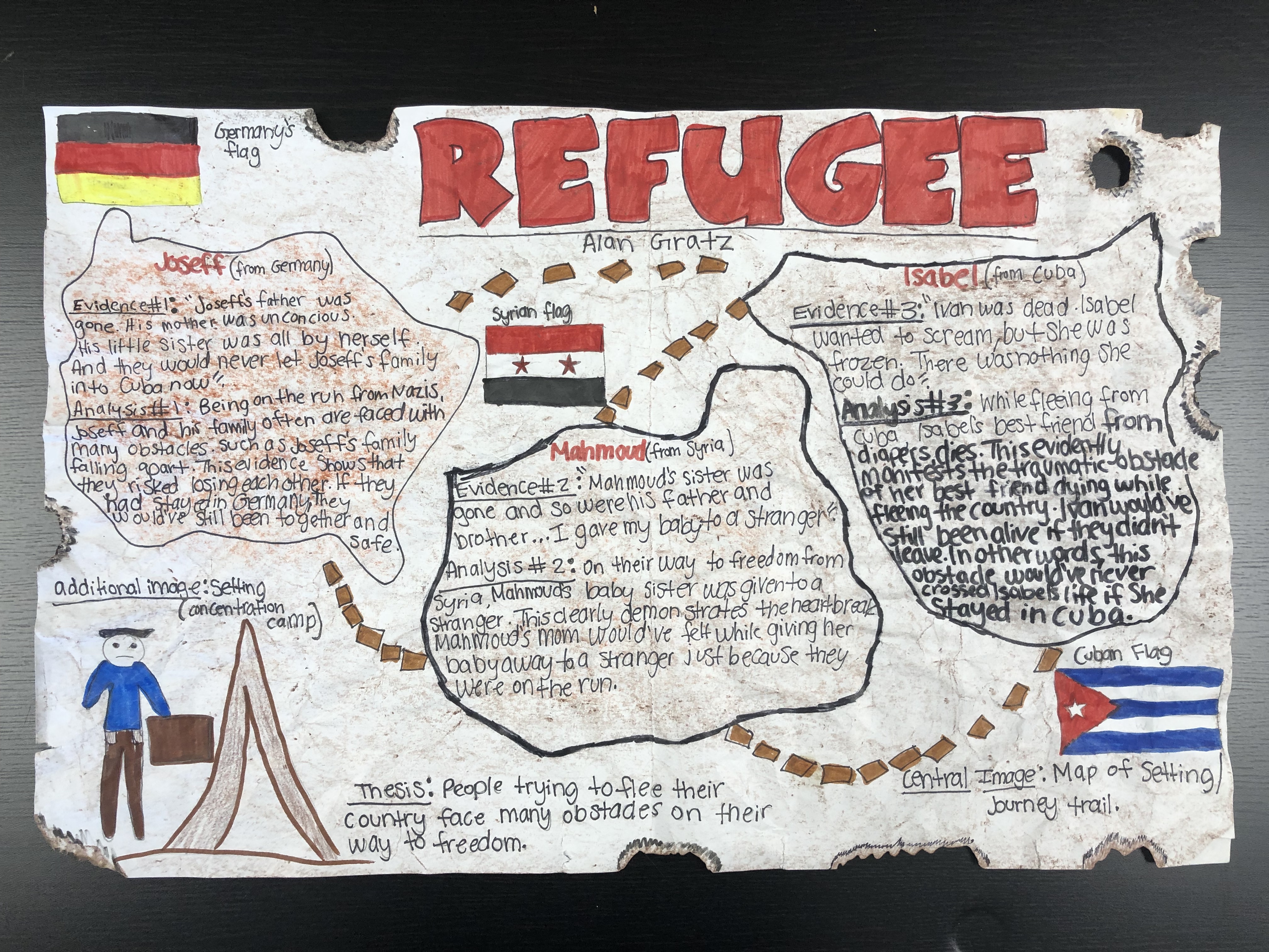 Danielle outlined the expectations (seen above) and provided time for students to organize their ideas before they began. The result? Beautiful graphic essays that included thematic statements (thesis), evidence to support the statements, and an analysis of each piece of evidence. She also challenged them to incorporate symbols that related to characters, setting, theme, or conflict.