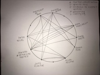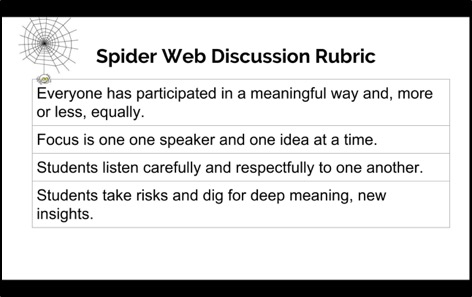 The discussion was timed and continued until the timer sounded. The teacher documented the discussion by creating the spiderweb while listening. Students can also document discussions as we have done in the past through the fishbowl. The web (shown left) was the one documented during the discussion (above). Notice how students were able to facilitate for themselves and keep the discussion moving.