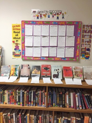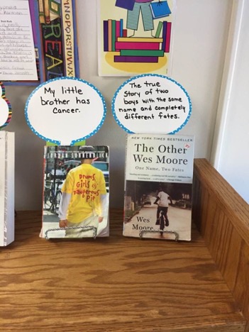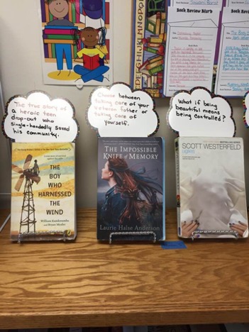 Mrs. Simon also has students write quick notes about the books they recommend as they finish then display the note with the book for students when they are browsing for new reads.