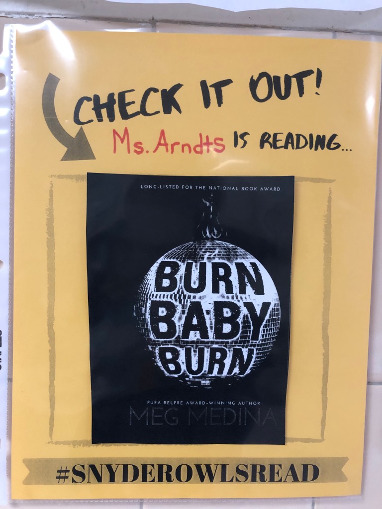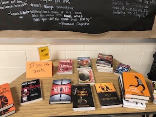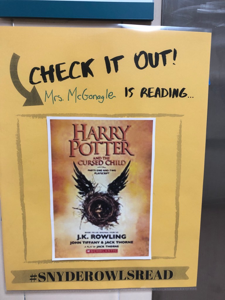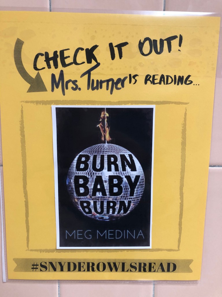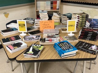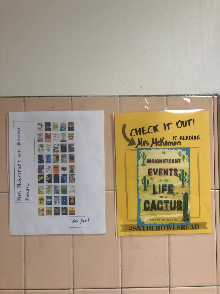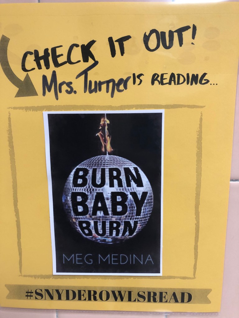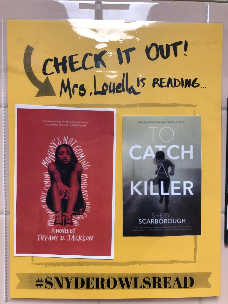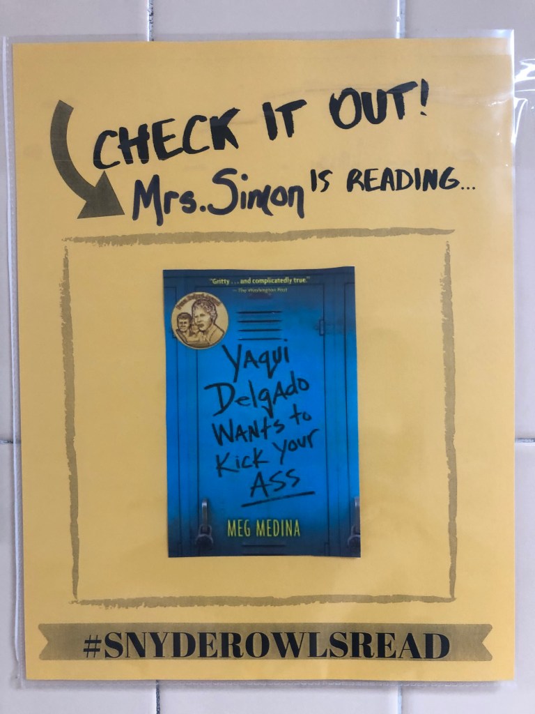 Mrs. Simon at Snyder is very well known for her amazing library displays and catchy blurbs. When she isn’t talking about books, she lets the blurbs do it for her.