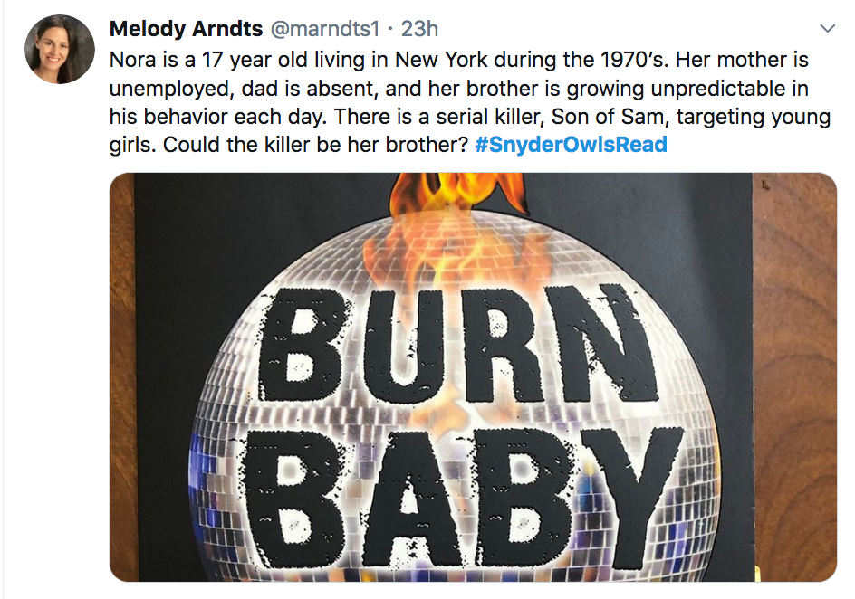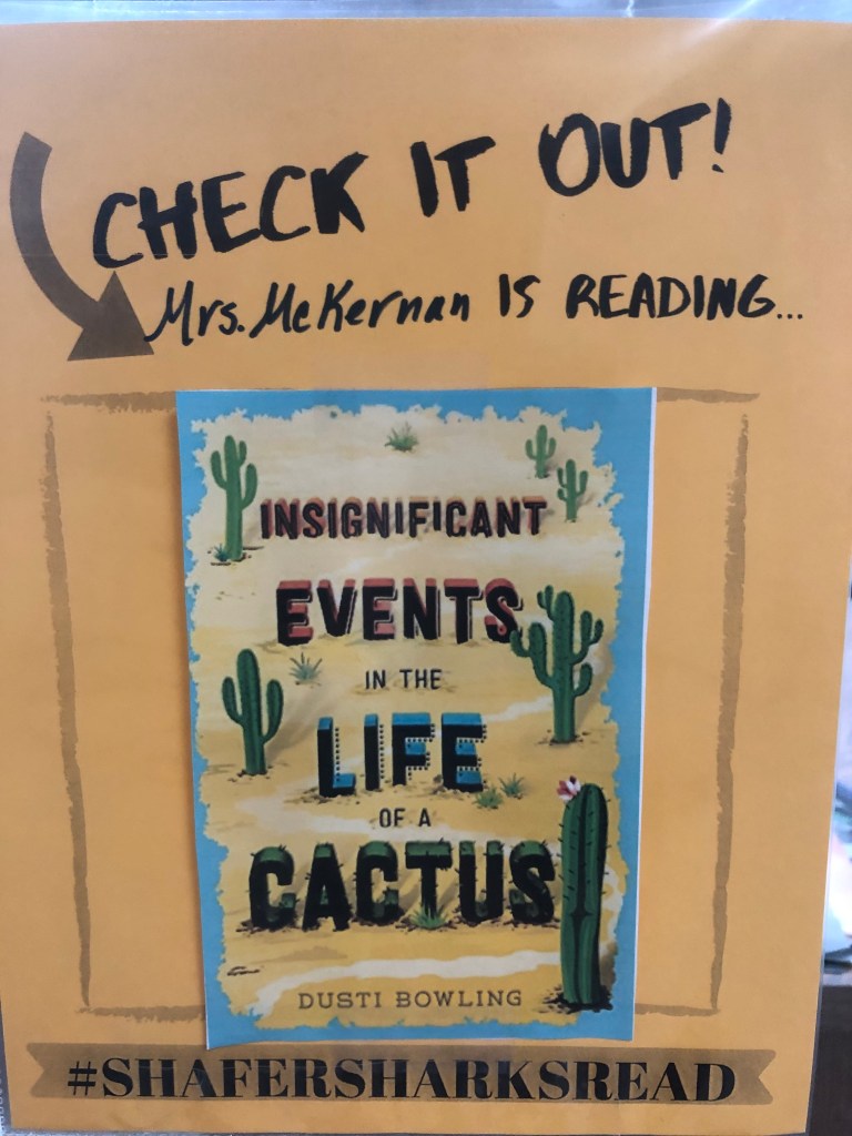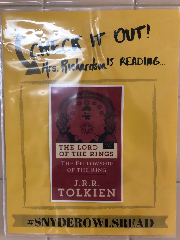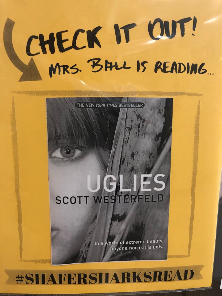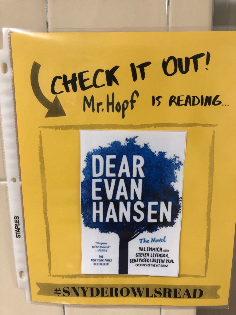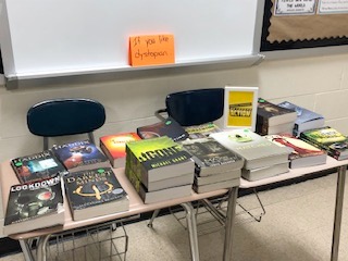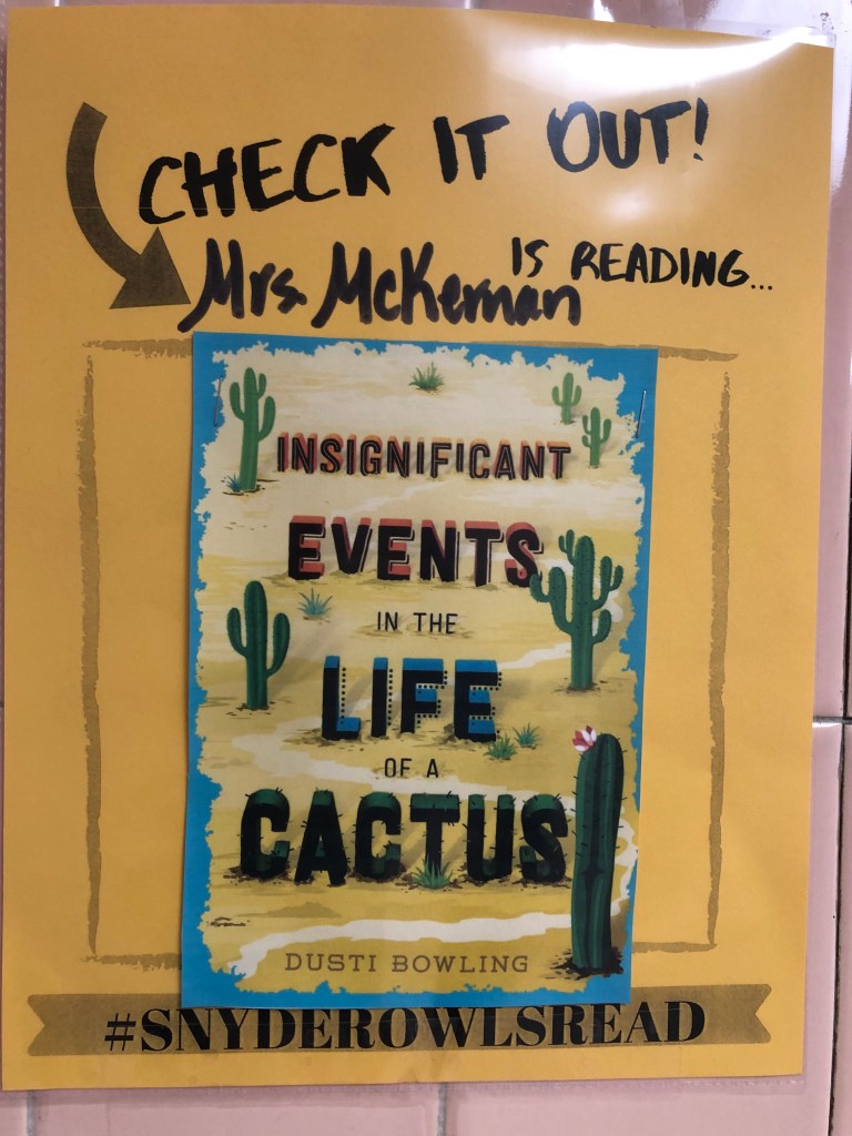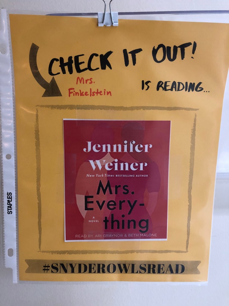 Mrs. Simon at Snyder is very well known for her amazing library displays and catchy blurbs. When she isn’t talking about books, she lets the blurbs do it for her.