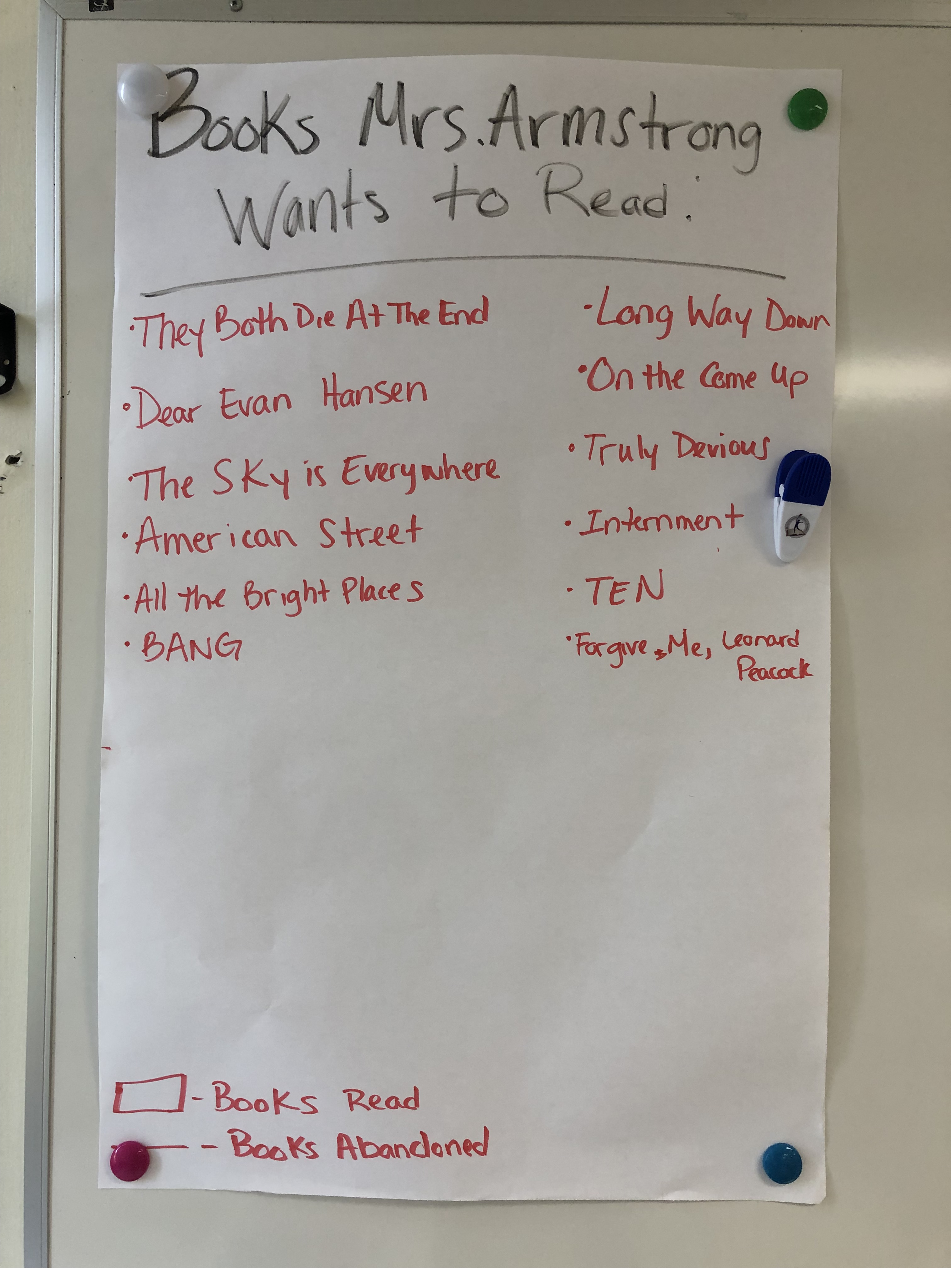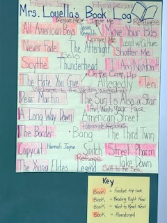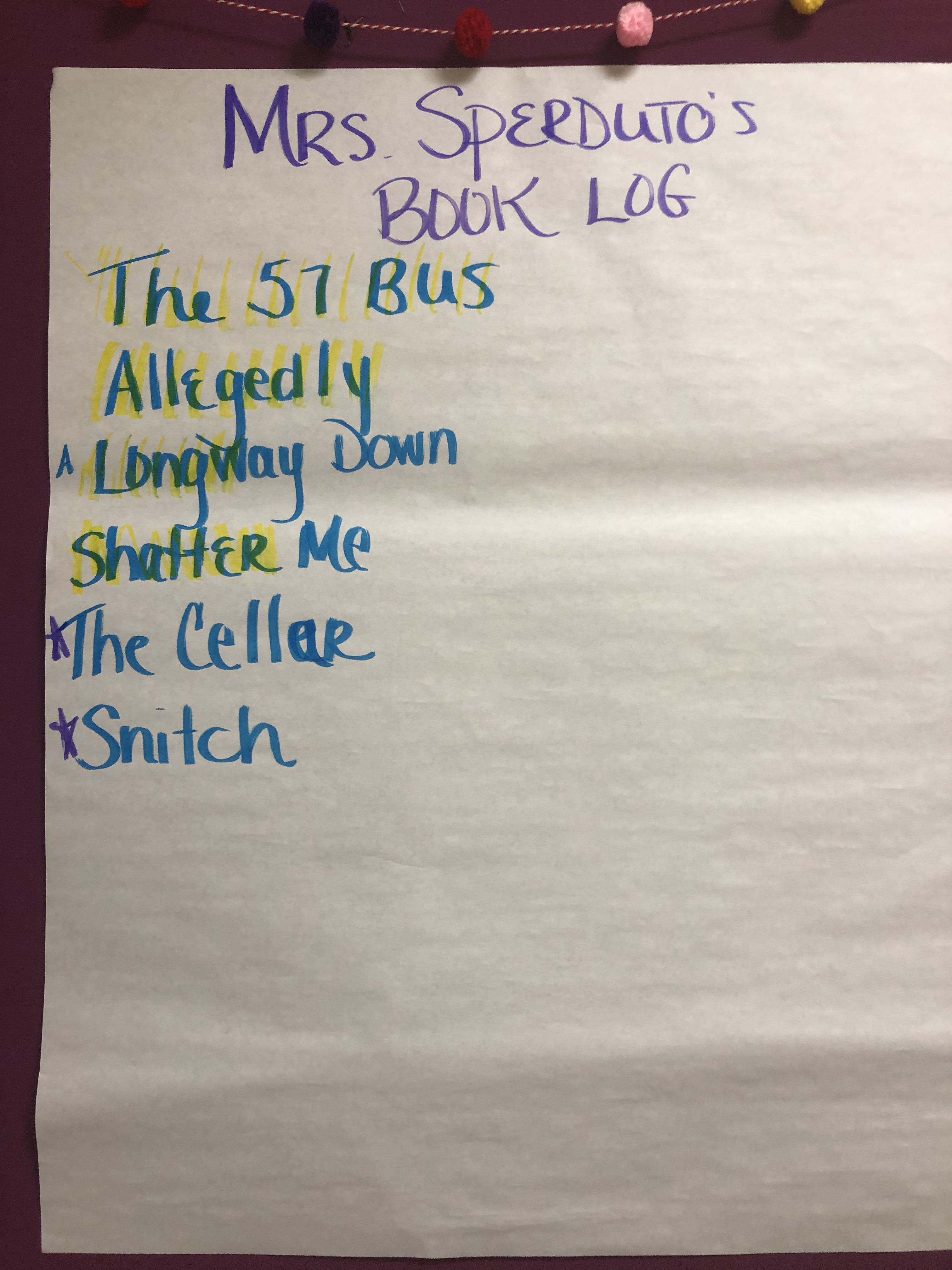 I’ve always kept my own reading log that was visible and updated regularly. My students kept a similar log. To the right was my log last year that I kept in one classroom for students to see my reading and then I would leave the books as I finished for them to borrow. As I visited the class and talked to kids about their reading, I shared mine and even added books they were reading that interested me.