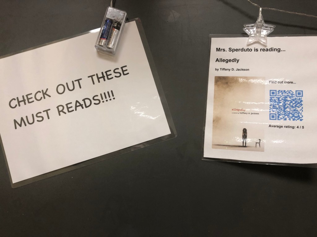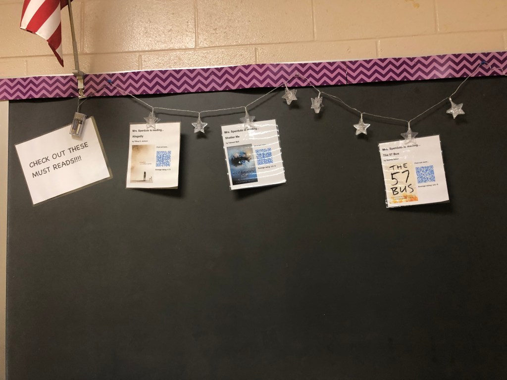 While visiting one classroom recently I noticed another way reading is shared. Mrs. Sperduto at Shafer is using What I’m Reading to display in her room. As she finishes a book, she adds to the string of “Must Reads”. Each print out has a QR code that takes readers to the Goodreads page for that book to read more about it.