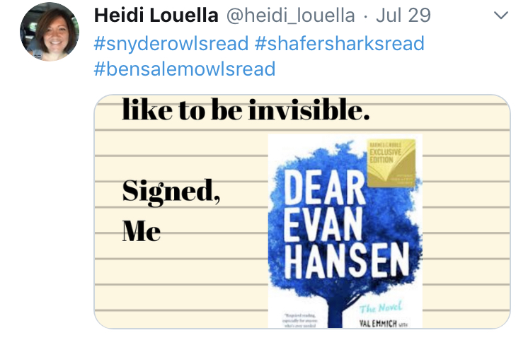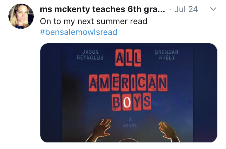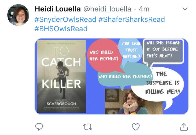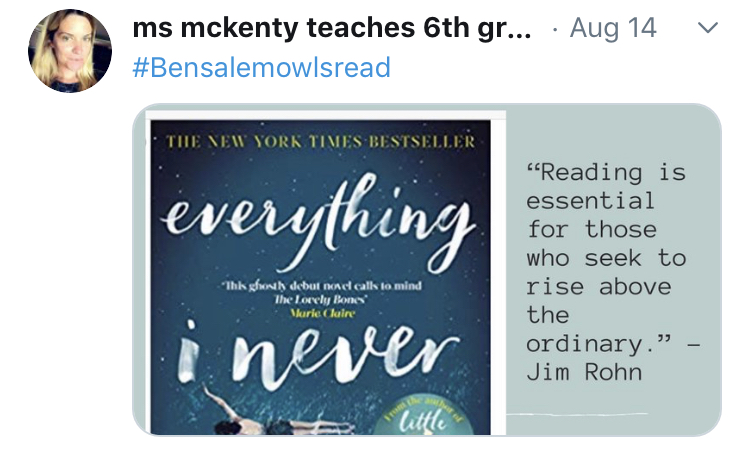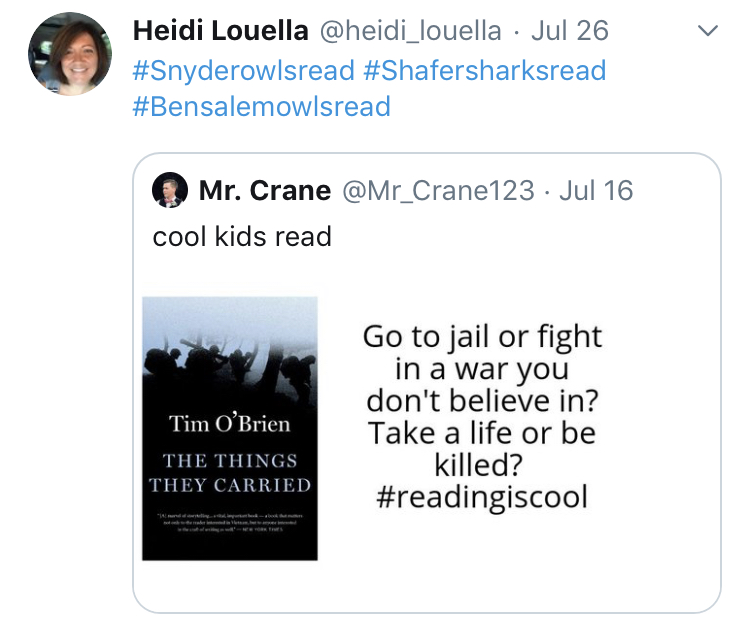 When reading teachers are reading what’s in their library, they become amazing resources because they can recommend and connect with kids so much faster. When teachers have asked me how I can easily conference with kids about books, my only response is because I read what they do. I have a pretty firm grasp on if you like this book or author then you’ll like this book or author too. If you are a middle schooler who refuses to read or reads at a lower level but do not want to read “baby books” I know some pretty edgy books that are mature, peak interest quick, and are less complex in readability. I can finish a book, create a one liner description, and it’s out of my hands immediately. I can read a book like Thirteen Reasons Why and be honest that I just didn’t understand why these reasons led to her decision. I told my kids, “I don’t know if it’s because I’m in my forties and just so far removed from being a teenager, but I don’t think these were reasons that were enough. But maybe I’m comparing them to real grown up problems that you don’t know about yet. I’m curious what you guys think.” And before I know it I have several kids reading it and we are discussing along the way what we think of these reasons. I don’t write all of this to brag and pat myself on the back. I’ve admitted here that I have not always been able to do this. But I can now because I read, I read as much as I expect my students to read, and the benefits are immediate and powerful.