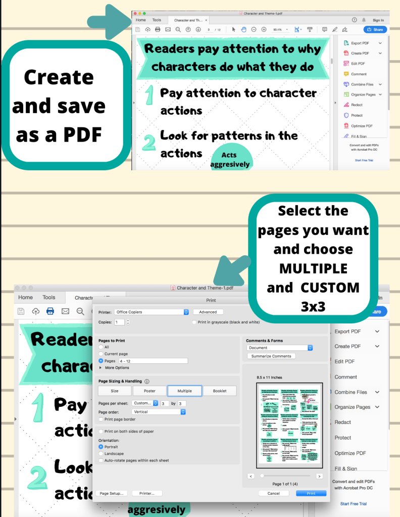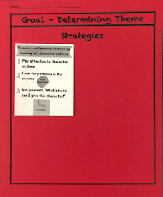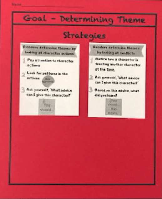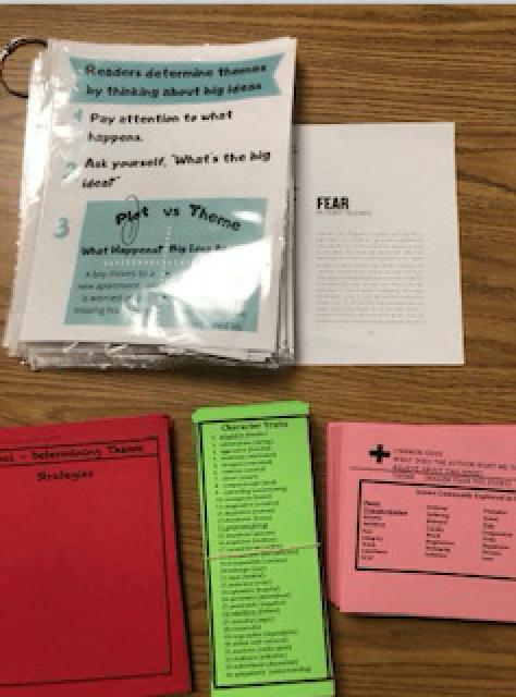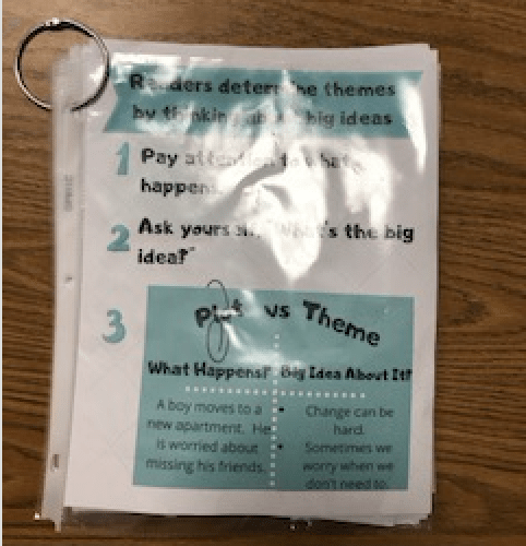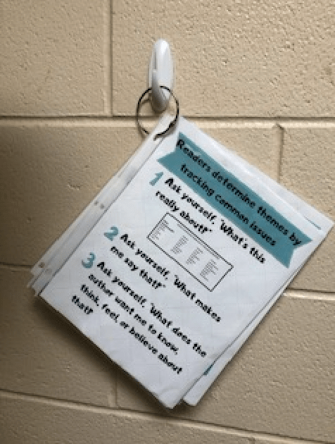 Tiered strategies can be clipped together for each skill (in this case determining theme) and even hung on a hook for teachers to have quick and easy access. I was also able to open the lessons in PDF and print multiple on one page using 3×3 in order to have an easy way to have something for creating a menu for students to take back to their seat which I put inside the sheet protector behind each strategy.