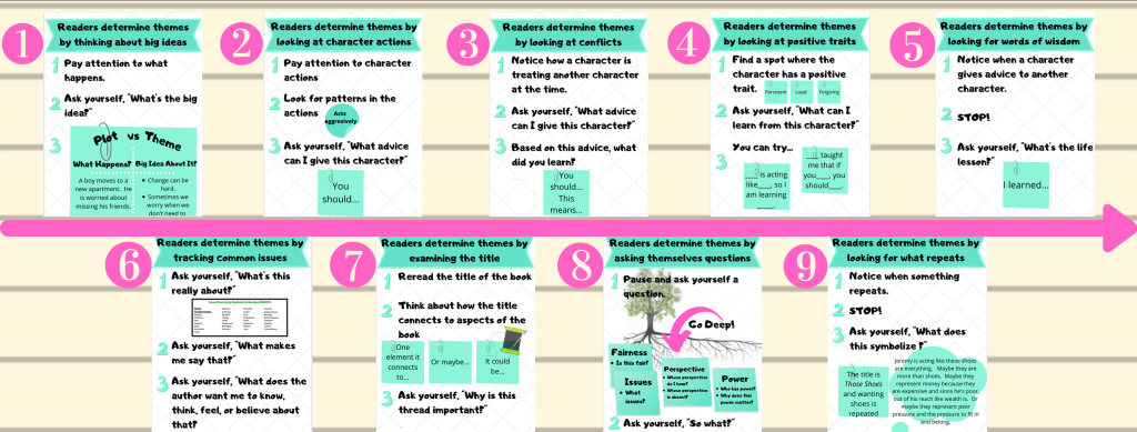 I took the learning progressions and armed with Serravallo’s Reading Strategies Book created tiered strategy lessons beginning with the difference between plot and theme all the way to pushing for deeper more sophisticated themes related to literary devices such as symbolism.