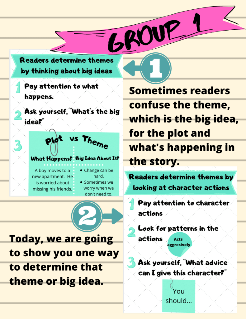 Bridget continued to present theme through the rigor of the minilesson, but knew that that alone was not going to be what students needed. After a couple days modeling how to determine theme using the mentor text, Bridget was ready to pull small groups.