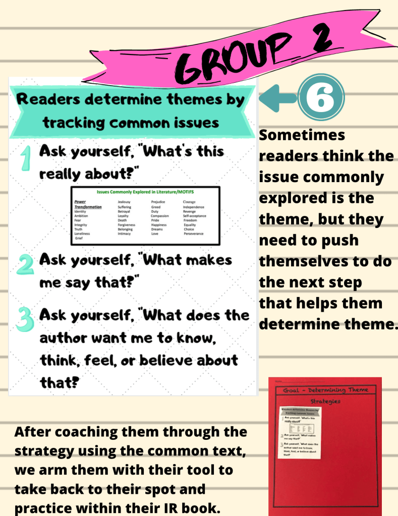 As Bridget continues to meet with this group, she will check in on how they are using the strategy, coach kids within their own reading, and present the next strategy in the progression of tiered lessons. Again she will send them off, but now with two strategies to use to guide their thinking about theme.