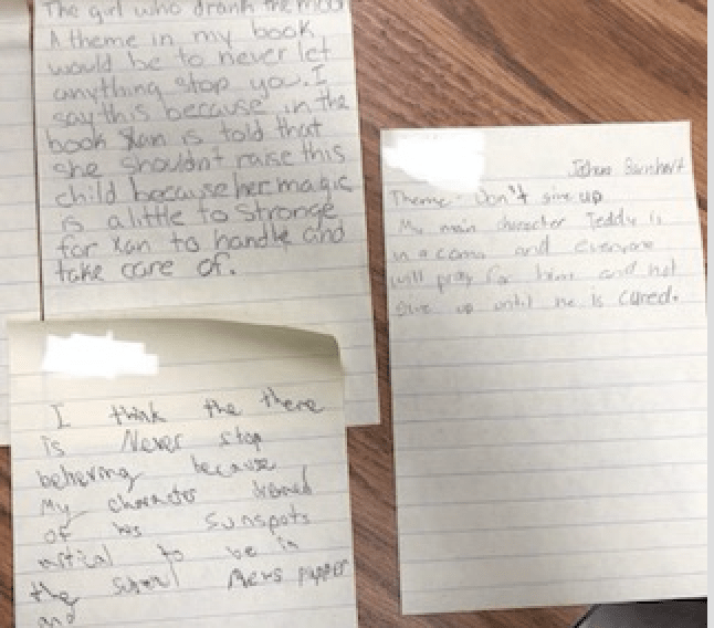 We gave students a long post it note with lines and told them we wanted to see where they were in their thinking about theme so we could determine what they needed to move forward. We set the timer for two minutes and had them write down one current theme they were noticing in their independent reading book along with what in the text made them say that. Some really wanted guidance, but we assured them we needed to see what they know, kind of know, or don’t know at all about determining theme.