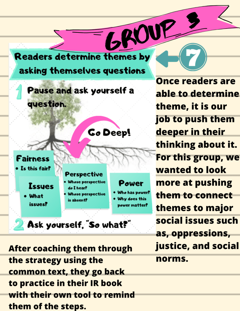 The answer is ABSOLUTELY! As you present a strategy, you are guiding students to use a lens, look for patterns, and determine a new understanding. In the case of this first group, we showed them how to look closely at a character’s actions, notice patterns, and use them to determine theme. The next strategy lesson for this group will involve looking closely at conflict to do the same thing!