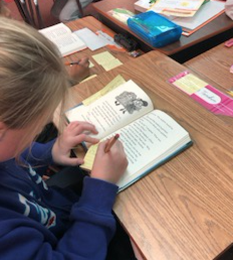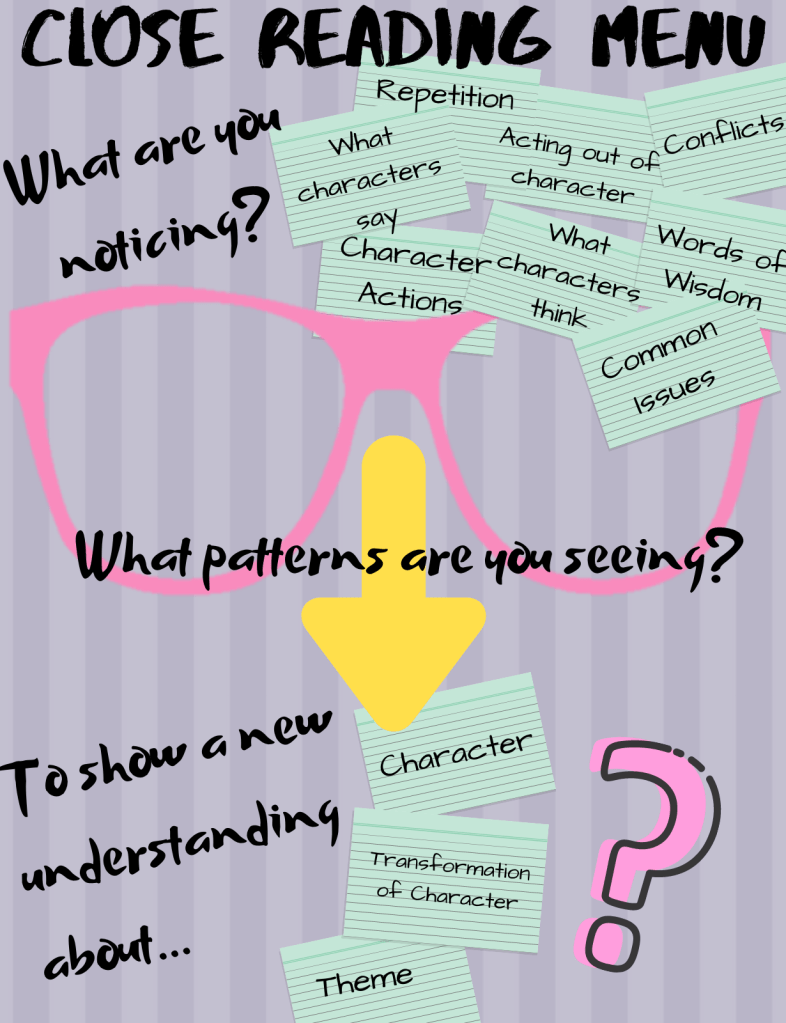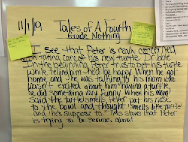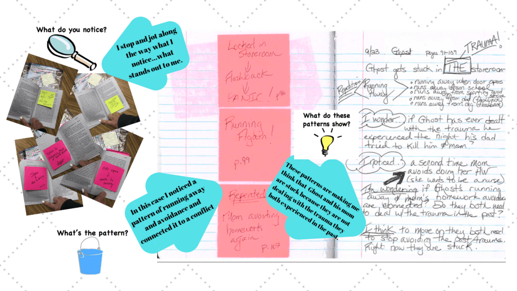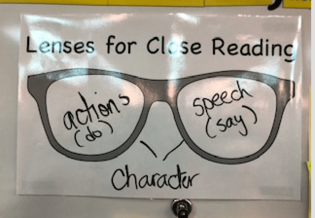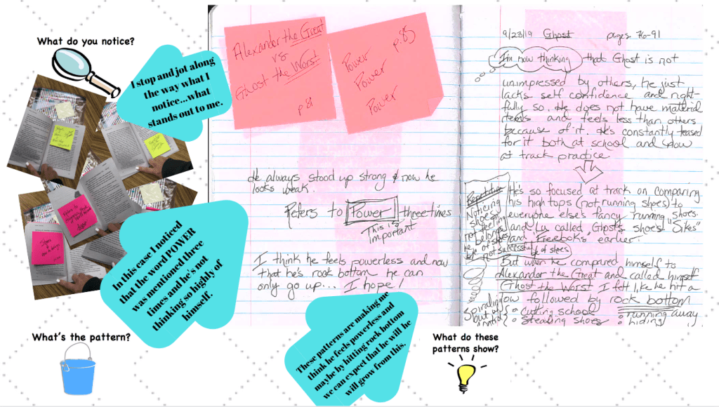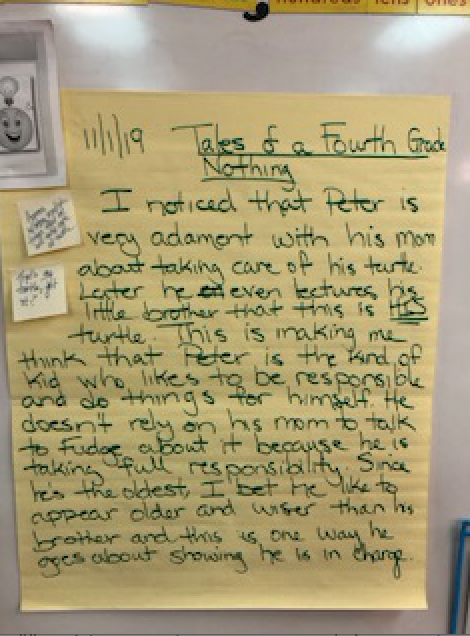 Fourth grade teacher, Michelle, has started doing this work with her kids and writing about her thinking while reading in front of kids. She modeled the pattern she noticed by looking closely at what characters do and say to think deeper about the character and encouraged her students to do similar work during independent reading.
