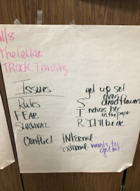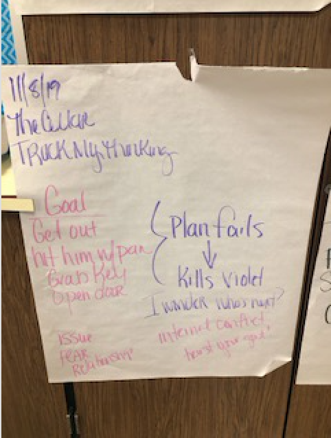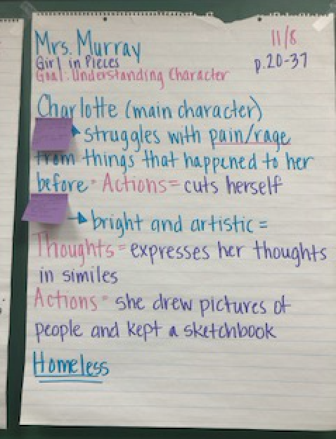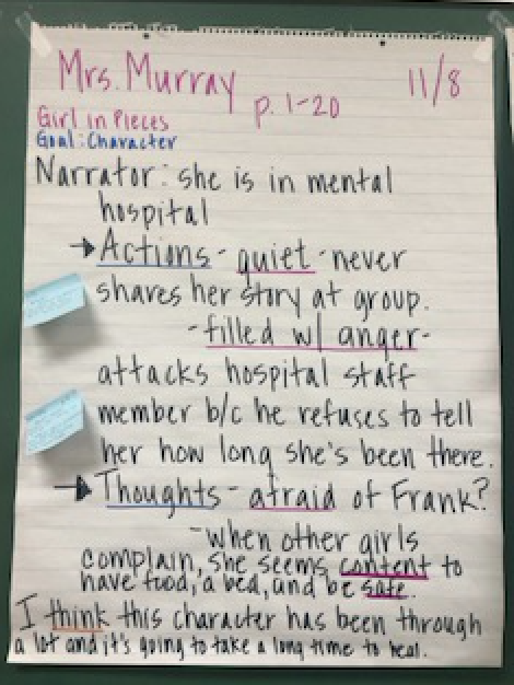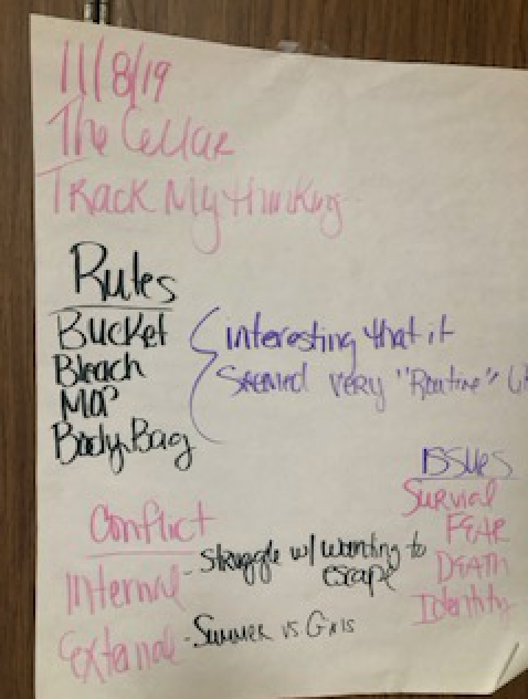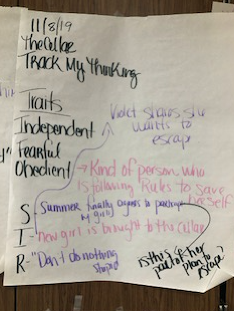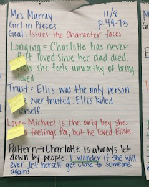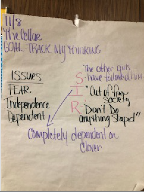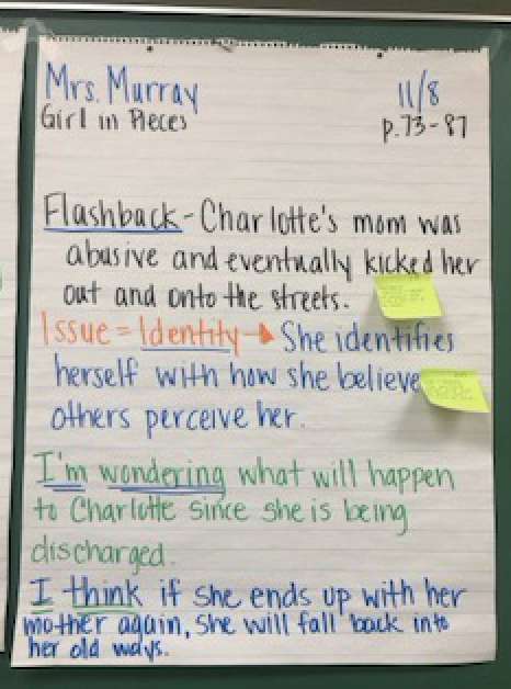 I’ll leave you with two more examples of tracking thinking in front of students. I recently visited Diane’s eighth grade and Bridget’s seventh grade classrooms and found that both were using chart paper to model for students their own thinking while reading their independent books Girl in Pieces and The Cellar.