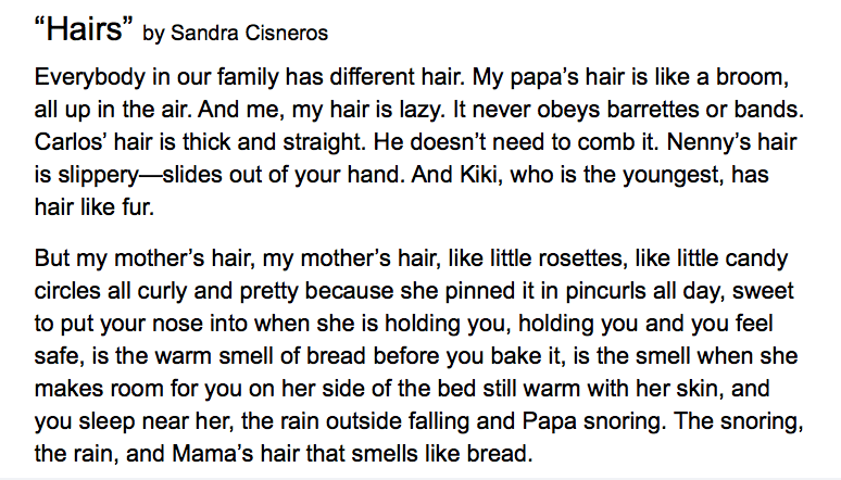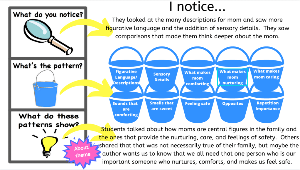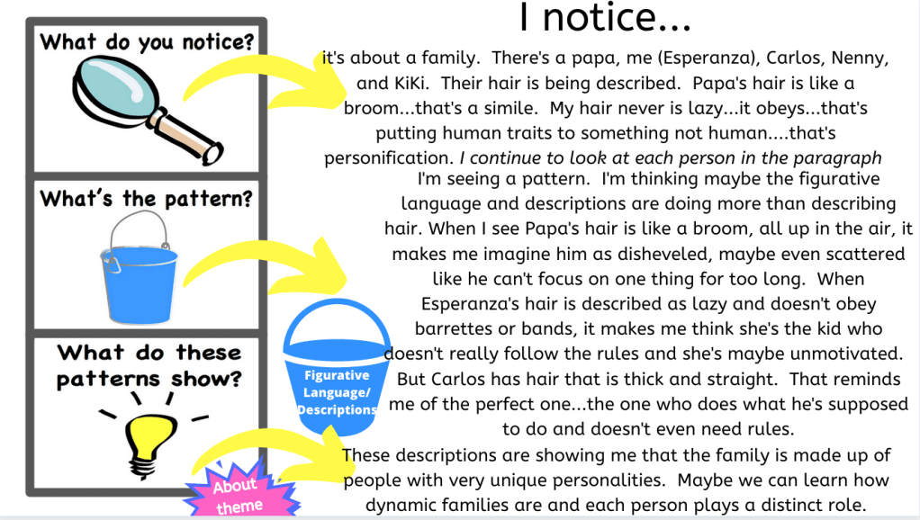 I showed them what I noticed and how I was seeing patterns of descriptions and comparisons using figurative language. By looking closely at the figurative language I discovered that maybe it wasn’t the hair that was being described but the personality of each family member in paragraph one. I then ask myself, what does the author want me to know, think, feel, or believe about this? to think about theme.
