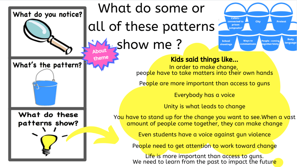 When a partnership in sixth grade at Cornwells Elementary saw the pattern of the same colors, they didn’t know what to make of it. I told them about the discussion the boys at Belmont had. Another partnership overheard and shared they too saw the pattern, but they were thinking the colors represented the school colors of a recent school that faced gun violence and the protesters were using those school colors to show support.