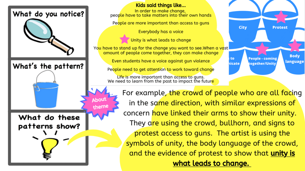 After modeling, I guide students through the process one step at a time, but relying on them to do the heavy lifting with their turn and talk partner. This image has been great for differentiating between evidence I notice and inferences I’m making (buckets). For example, as students turn and talk, if I hear in step one, “I notice a protest,” I will ask them to show me how they know. They will inevitably point to the signs, the gathering of people, the megaphone, the hashtags, and the open mouths. I will congratulate them for already noticing a pattern/bucket and they can jot that down, but they need to list everything they can explicitly and not implicitly see. The same goes for, “I notice a city.”