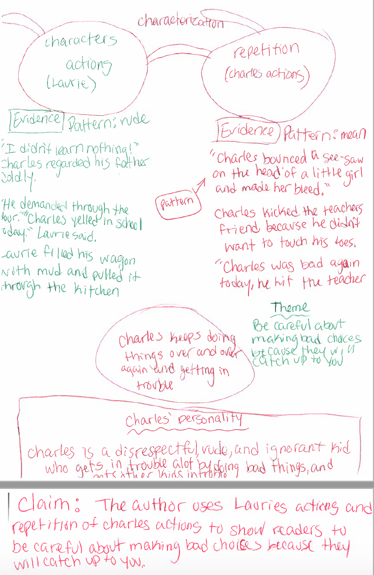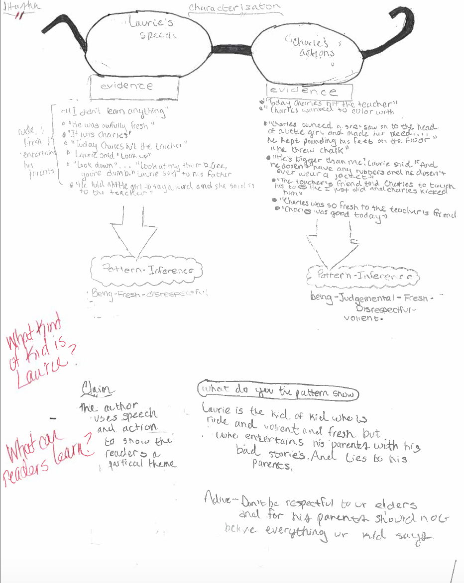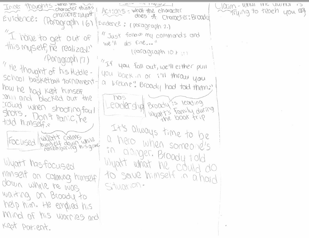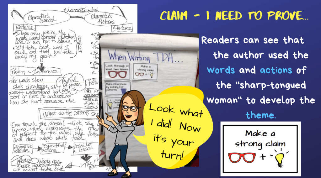 Students, for the most part, wrapped up their reading, noticing, and noting for the three texts and we moved on to the next minilesson. This lesson was to help them organize their thinking and push it a bit further, in order to determine their claim, what they had to prove in their essay. Each student chose the story they wanted to use to write their TDA and even though they have strong partnerships, they did not need to choose the same story as their partner. They know enough about all three stories that they can still be a support but have the choice that keeps them engaged.
