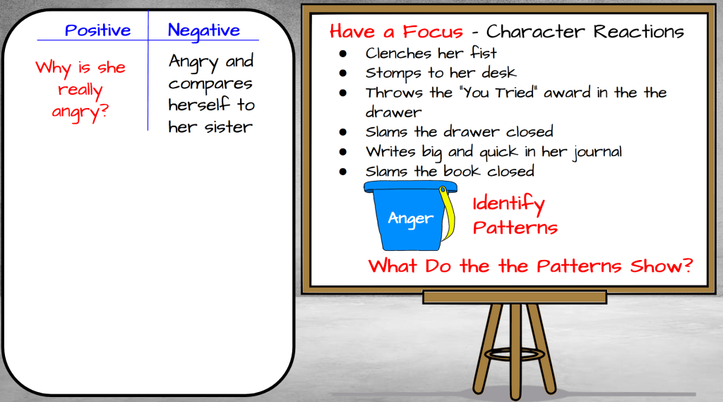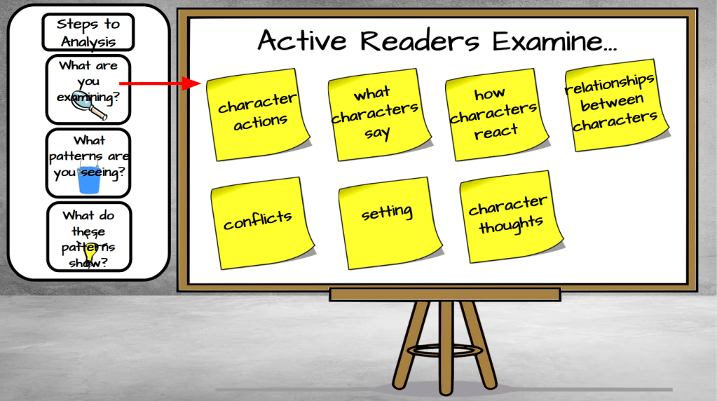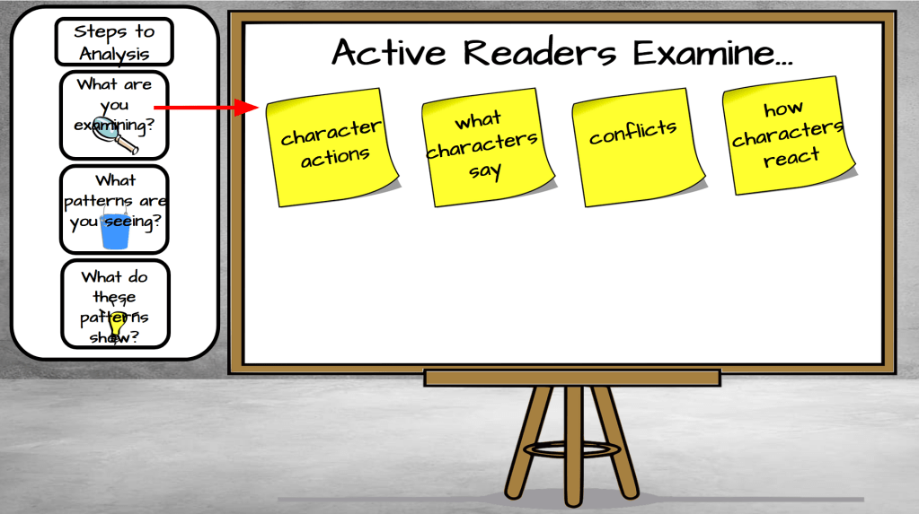 Here is a video of one such lesson. Today I am teaching active readers to examine how characters react. The strategy follows the basic model for analysis. What do I notice? What patterns am I seeing? What do these patterns show? You will see today’s focus and you will watch me model using a mentor text.