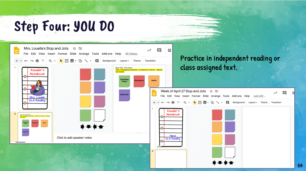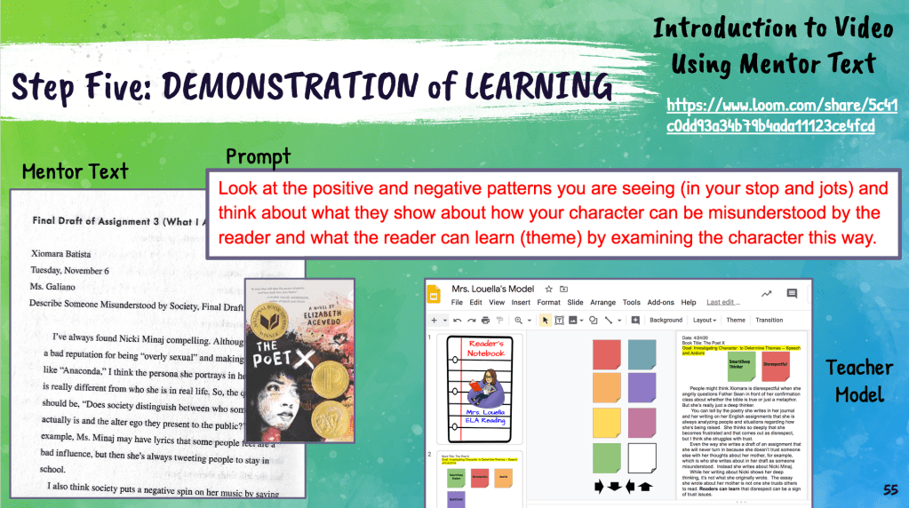 Students are using their independent reading to practice using the strategy by adding post-its to their reader’s notebook or are completing an assignment using the practice from their independent reading on the learning platform. This is formatively assessed to see who needs more support or more maybe more guided practice in a Zoom session. This is the work that lets us know when they are ready for the last step and demonstrate learning.
