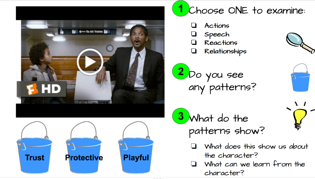 Once the learning objective is determined and communicated, the second step is to model the strategy or content. This is where the students watch you do this work with a mentor text. I chose to use a video. I created a mini unit recently that maps out all the ways readers can determine theme by examining character. I then went on a hunt looking for video clips and short films, and as I watched each one, I made notes about the possible lenses (from the anchor chart) that could be modeled and practiced using them. This is a nice way to use a nontraditional text in order to focus on the strategy and help level the playing field for student access. Not to mention, a nontraditional text is also often shorter and keeps the modeling down to a small chunk of time.