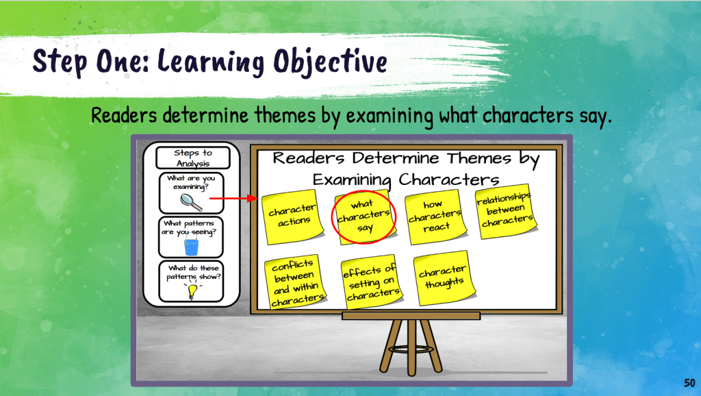 Learning objectives can come straight from the anchor charts we are using to guide instruction. In this example, I am focusing on examining character speech to determine themes.