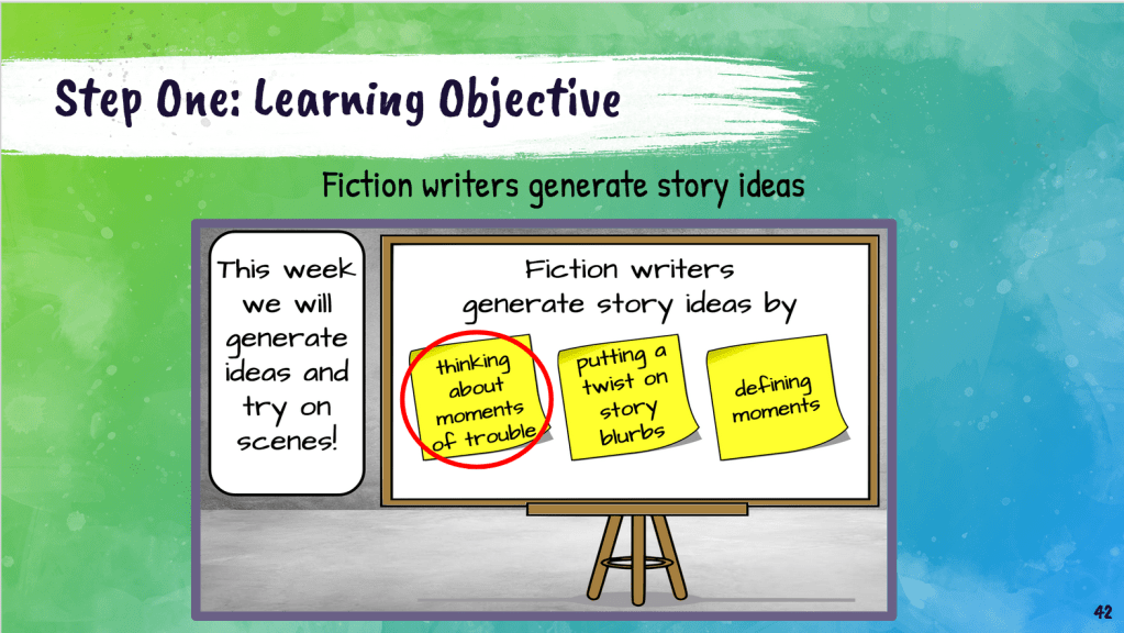 In this writing example, however, the focus is on the ways to generate story ideas starting with thinking about moments of trouble.
