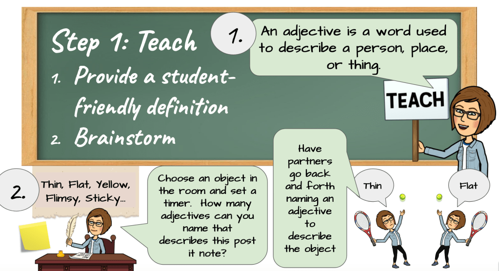 First, introduce a student-friendly definition. In this case, we are thinking about adjectives. Then allow students time to brainstorm. Whether they are in person or remote they can pick something in the classroom or in their home to describe coming up with as many examples as possible in a specified period of time.