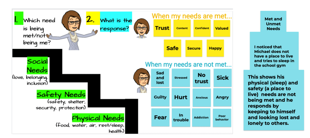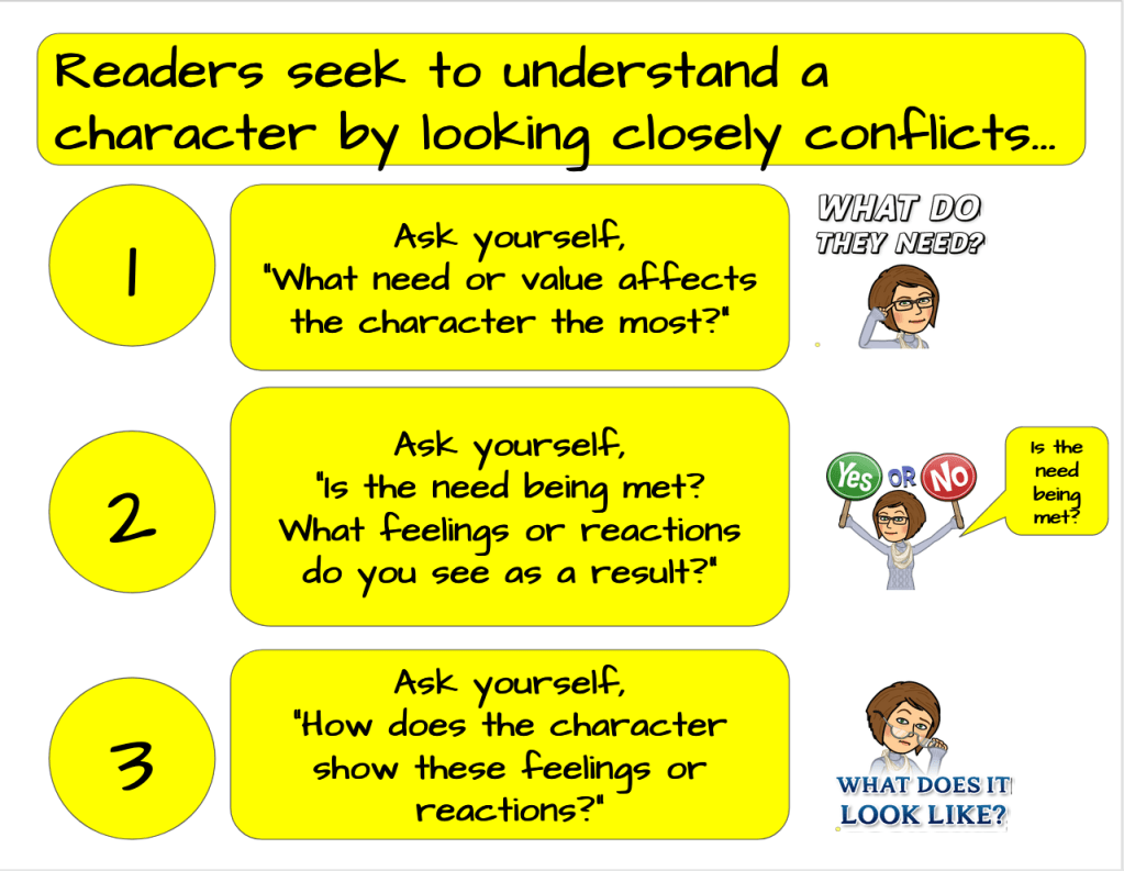 I consulted with Brandi Hamnett, our SEL Instructional Coach, and she helped me lean on the work of Nonviolent Communication, which is about seeking to understand while building connection and empathy in conflict. This work is not only important as teachers who seek to understand our students without judgement, but for kids to to use in their own relationships as well, and what better way to practice this work than with characters!