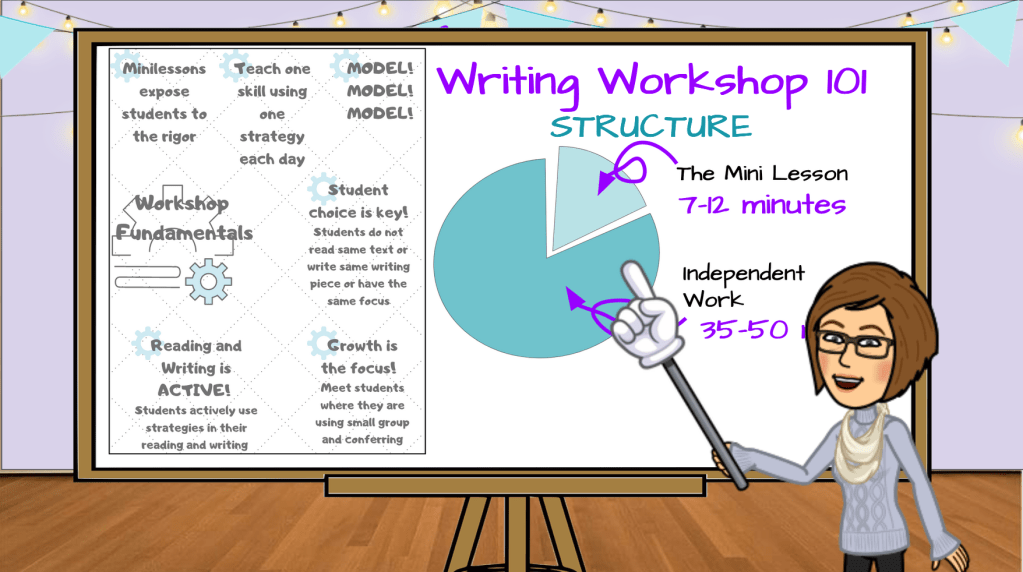 Think about this time with writers while conferring and pulling small groups as providing the right kind of support for individuals. The skills taught with your own writing in the minilesson are on or even slightly above grade level. It provides opportunities for exposure to higher level skills and rigor. But expecting mastery or even growth from this level for every student is unrealistic. They still need the exposure to the on grade level work and rigor, which is why the minilesson is such a small chunk of time. Once they move to the independent work time, they need differentiated instruction and time to practice and grow from that place. Think about it in terms of weight training. If doing curls with say 25 pound weights is considered “on grade level” does that mean it’s appropriate to hand 25 pound weights to every student and say, “Have at it!” Of course not. Some will need to start with learning form and building up from 5lbs, others, 8lbs, others 10lbs, and some may even need 30lbs. That is the power and beauty of conferring and small group. It is meeting writers where they are and providing the specific instruction they need to grow from that point.