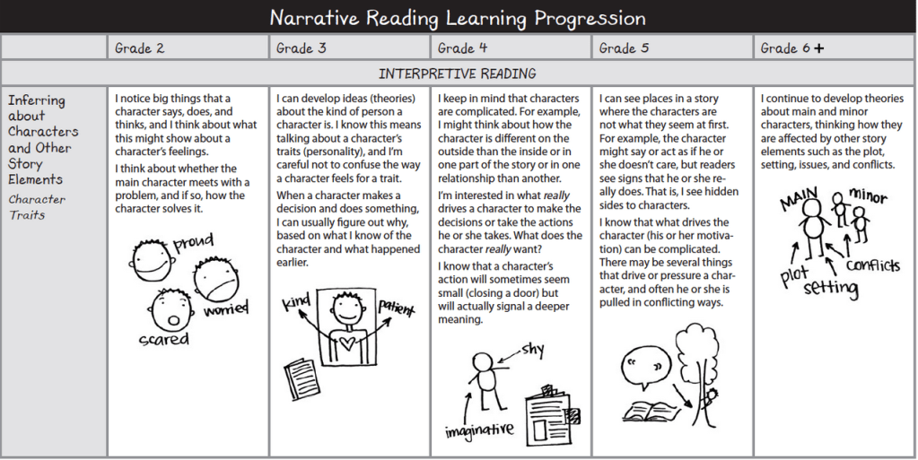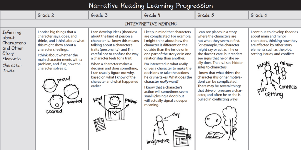 Everything we do should be linked back to the learning progressions in order to move readers forward. Using a highlighter, highlight the specific things students can do at each level for that skill then make a post it note for each. The anchor chart that you create using the progressions can be a tool for your conferences as you move about the room looking at current writing in the the reader’s notebook to determine where they are, what to compliment, and what to teach.