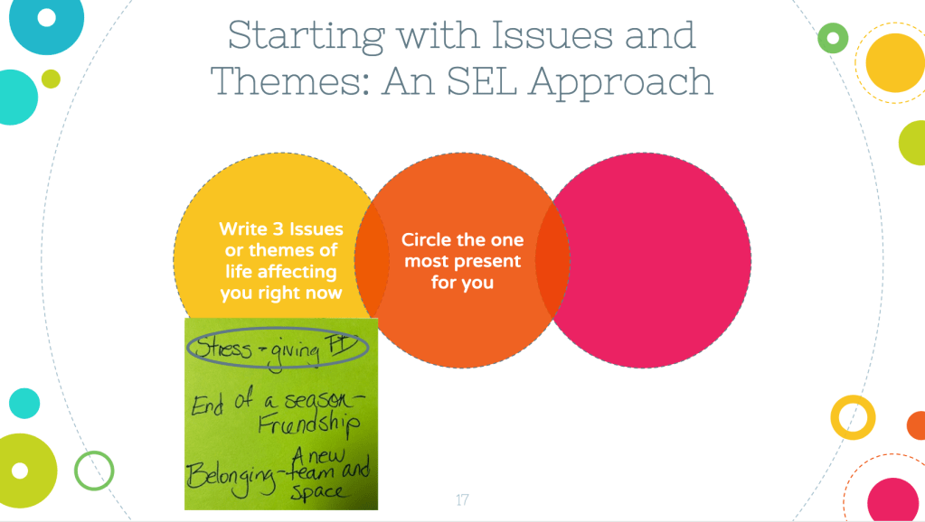 While sharing this strategy during professional development with teachers, I chose my issue of the stress I was feeling going into that particular day. I was feeling stressed, anxious, and overwhelmed, but also excited to share some tools that teachers could take back to their classrooms.