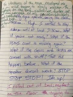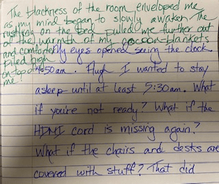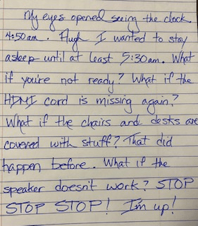 I always recommend writing alongside student writers. It has value for writers to see how you go about writing even when it’s tough. My action part was a struggle for me, and I didn’t get much accomplished during that 2 minutes and it is okay!