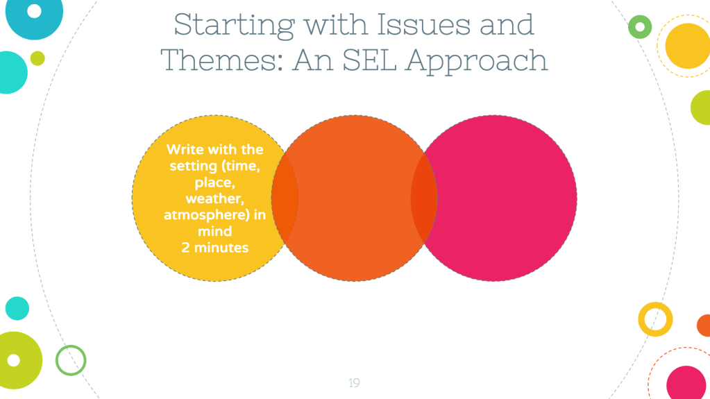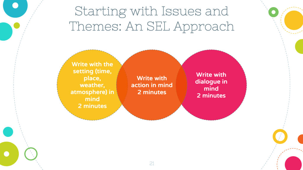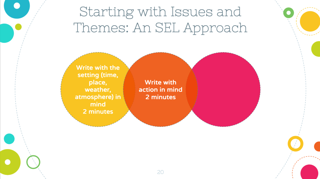 While this exercise is an SEL approach, it is also a strategy for generating ideas and revising with different craft moves in mind. By doing this exercise at times, we are building a bank of small moments and issues that writers can choose to return to while providing opportunities to practice writing moves that can be applied within any writing piece.