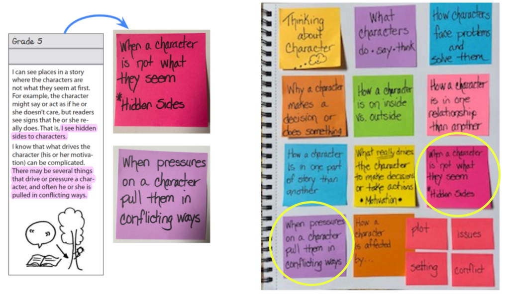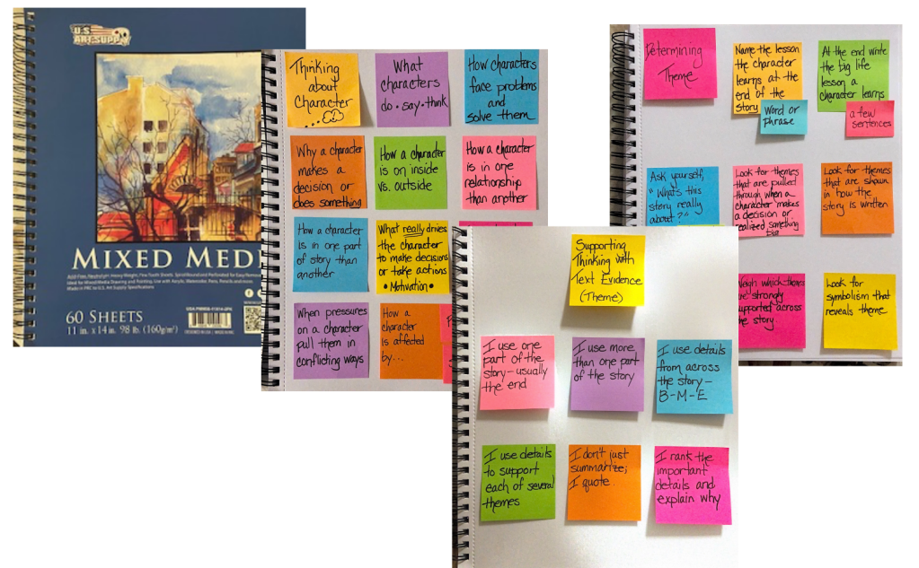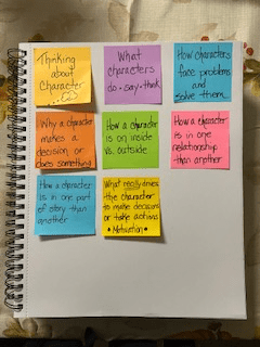Sketchbooks are great for making tools that can be carried around for table conferences. And when made in advance, while pairing with a mentor text or read aloud, your planning is minimal. These conferences are research conferences. See where the reader is in this moment, compliment what they are doing already, and use the progression of post its to determine what they need next.