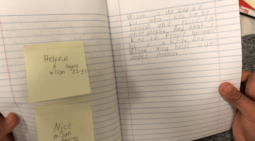 In this example a student recently has been seeing patterns of the character Wilson being helpful and nice to other people. First, we want to compliment: Looks like you have a theory for your character based on patterns you are noticing. You are also using multiple character traits. What a great start!