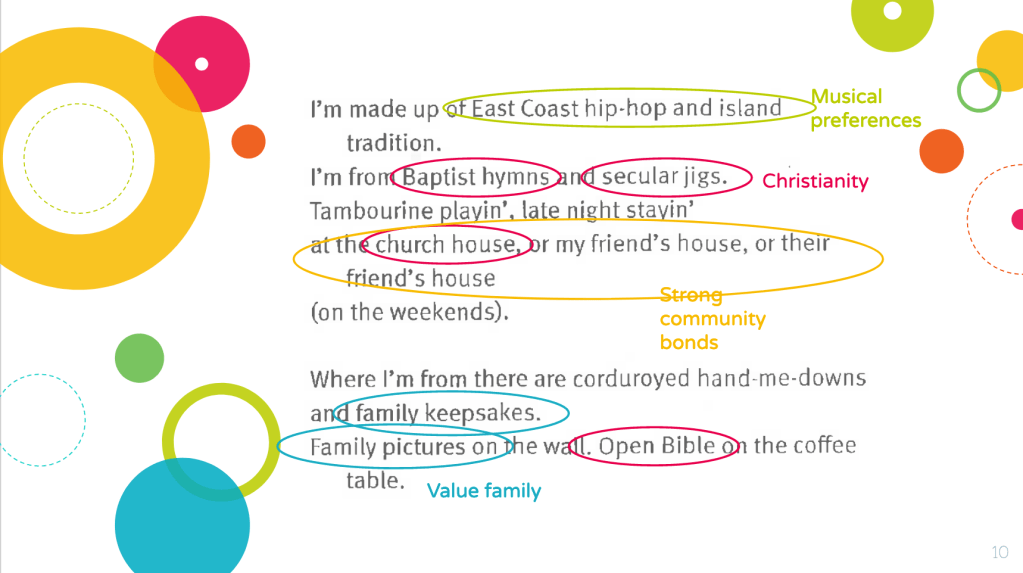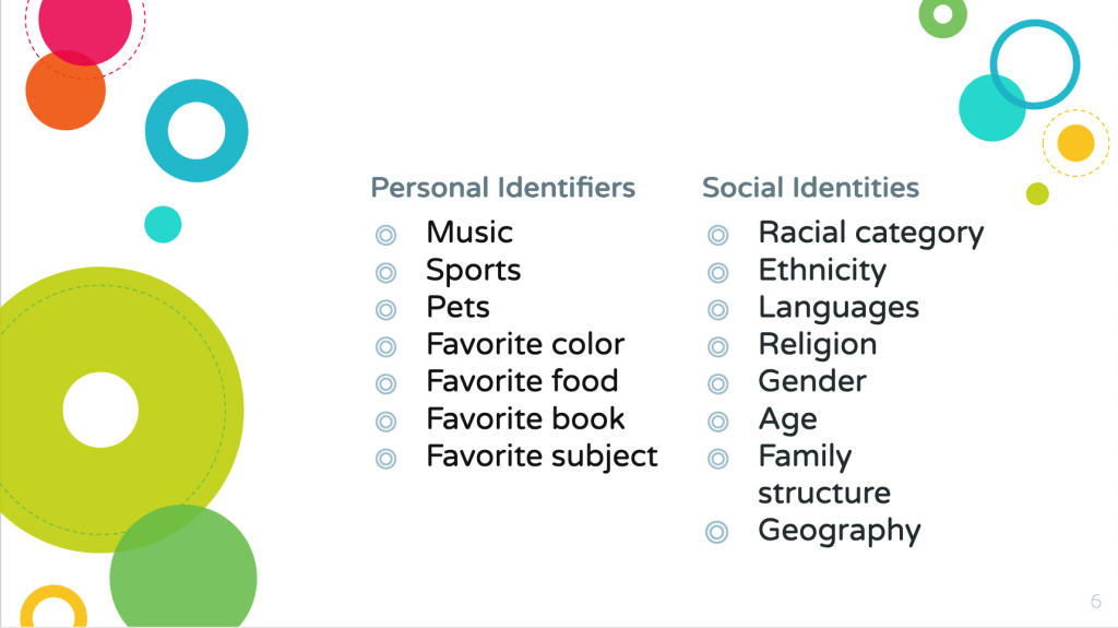 Writers bring their full selves to the page. When we examine writing as readers with these lenses in mind, we can see it and its value. When we work with our writers we want to provide the space for them to do the same kind of work. Even if it’s not a personal narrative or memoir piece, writers can bring the characters they create to life with personal and social identities or use them to strengthen their point-of-view and perspective in informational and argument pieces.