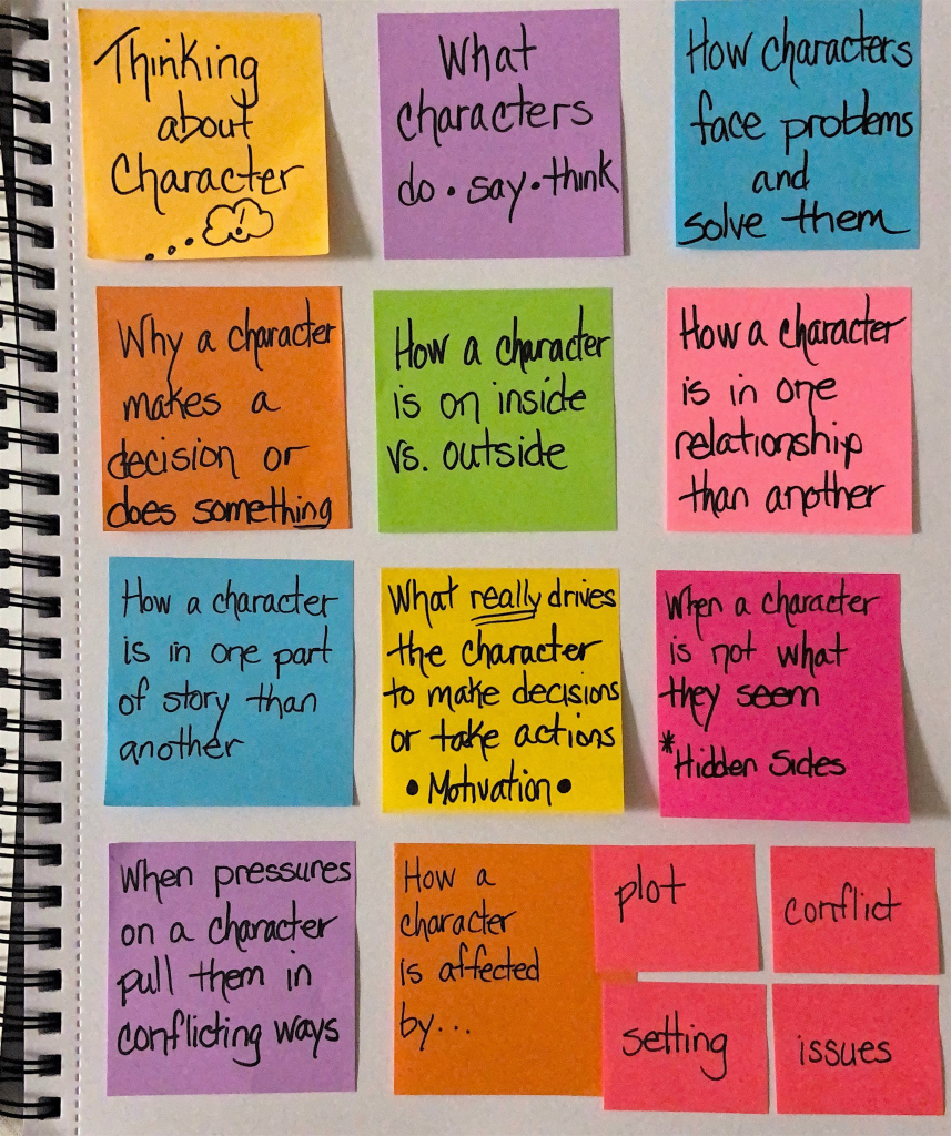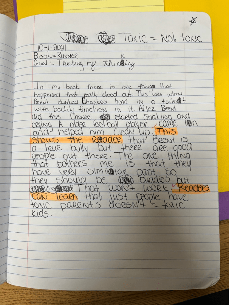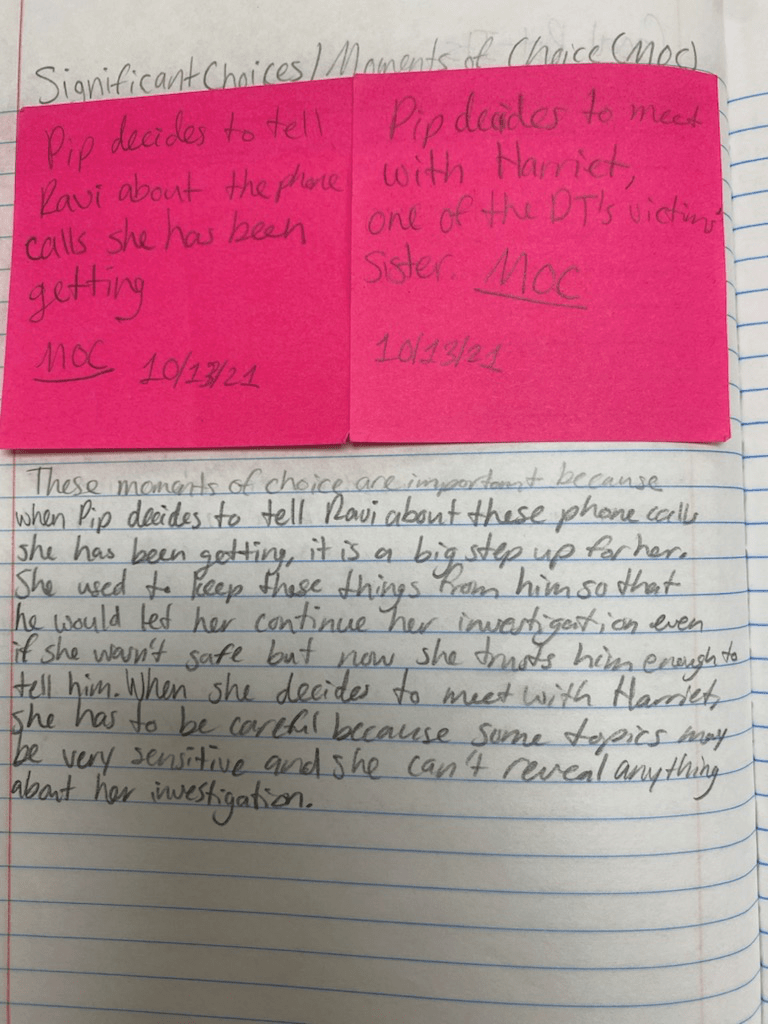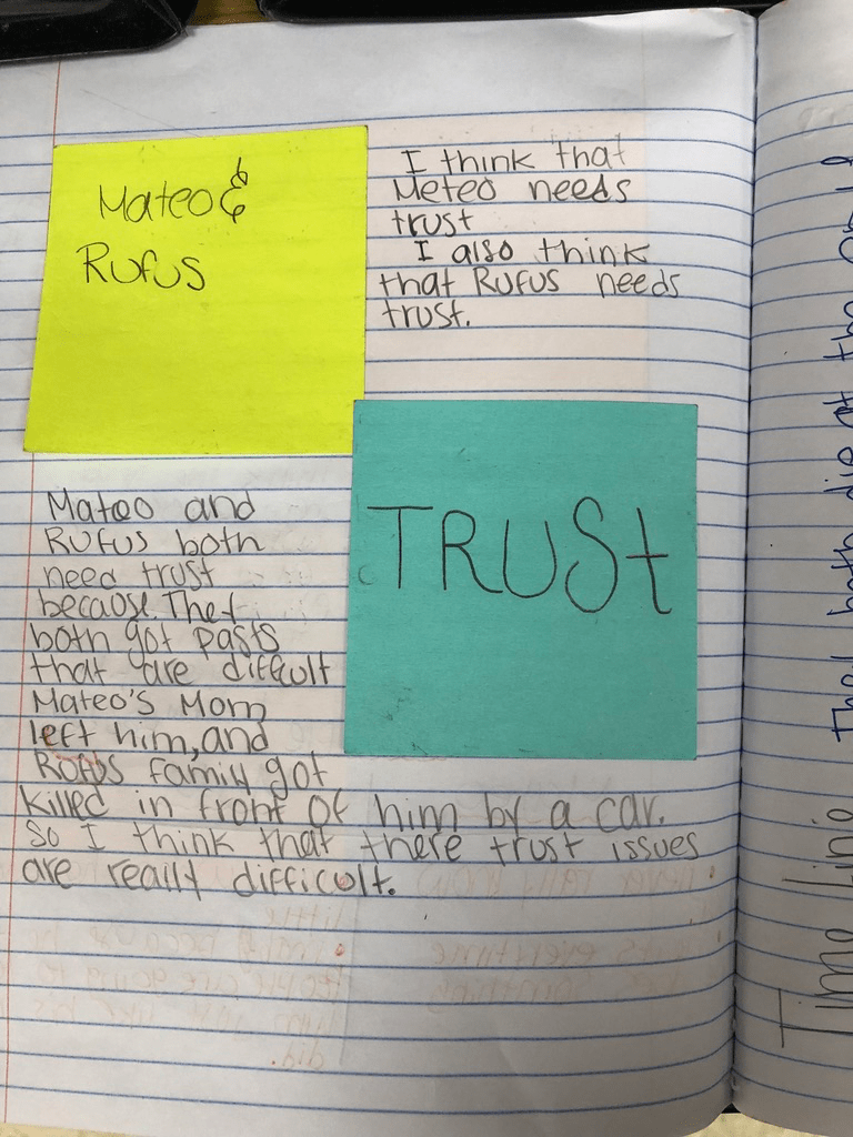 Above is an eighth grade notebook page. This student is already thinking about motivation behind the pattern for two different characters who don’t have trust. The compliment: Look at the way you not only notice that both Rufus and Matteo have trust issues but you are asking yourself why that might be the case. A next step might be to start looking at hidden sides, or how pressures pull characters into conflicting ways. Show students what this might look like in life or in a mentor text/read aloud then walk them through this thinking in their own book, leaving them to continue to look through this additional lens.