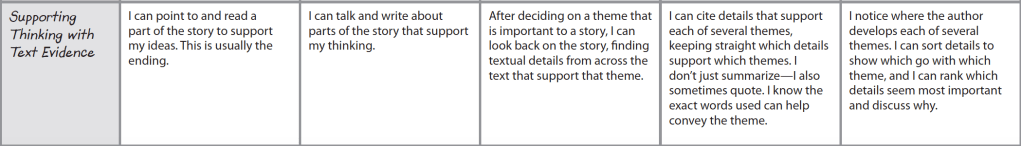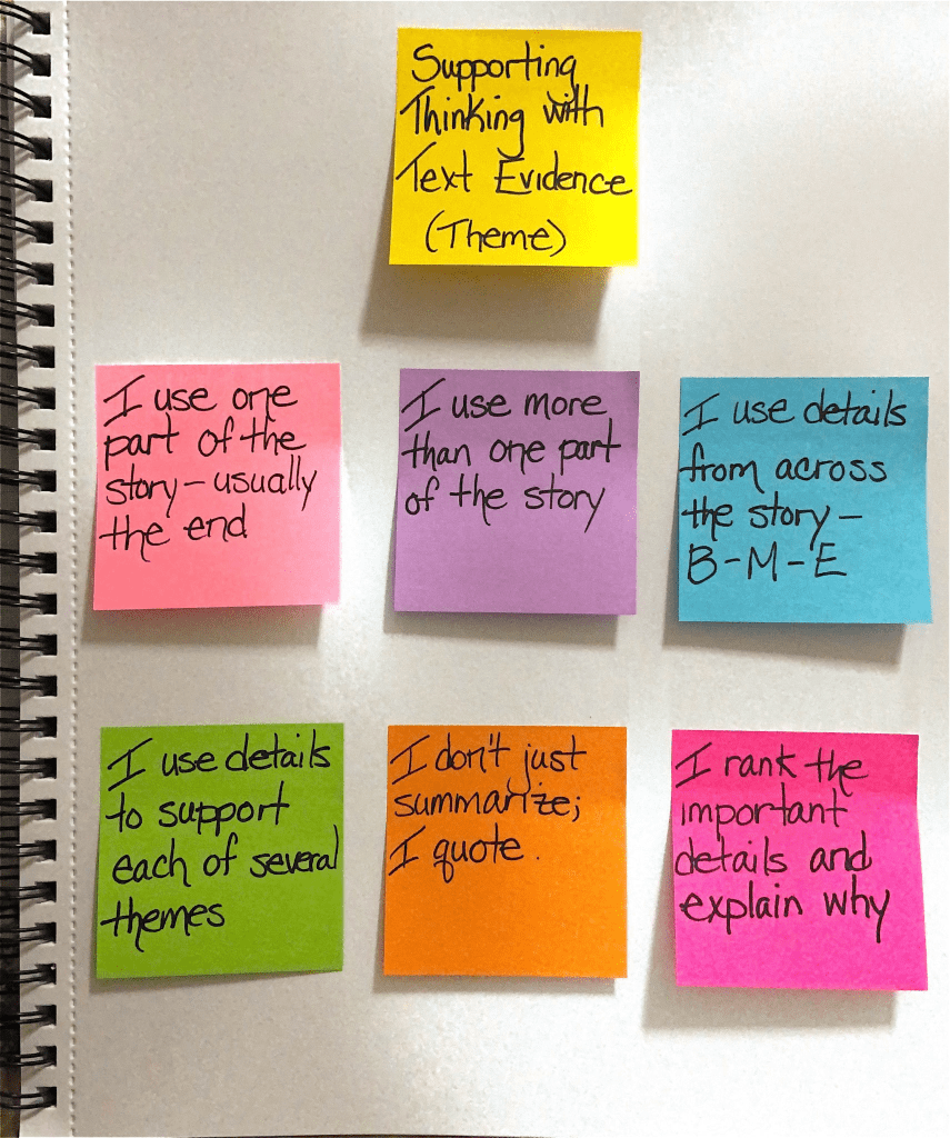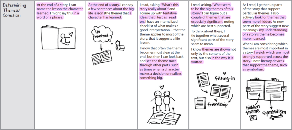 In this entry from a notebook, I am seeing an obvious theme — There are good people out there. But the reader pushes further and a more hidden theme is revealed — Having toxic parents doesn’t mean having toxic kids. Looking at this hidden theme, I want to know how this is being pulled through. using the evidence, and so I would refer to a new anchor chart that is based on the learning progressions for supporting thinking about theme with textual evidence.