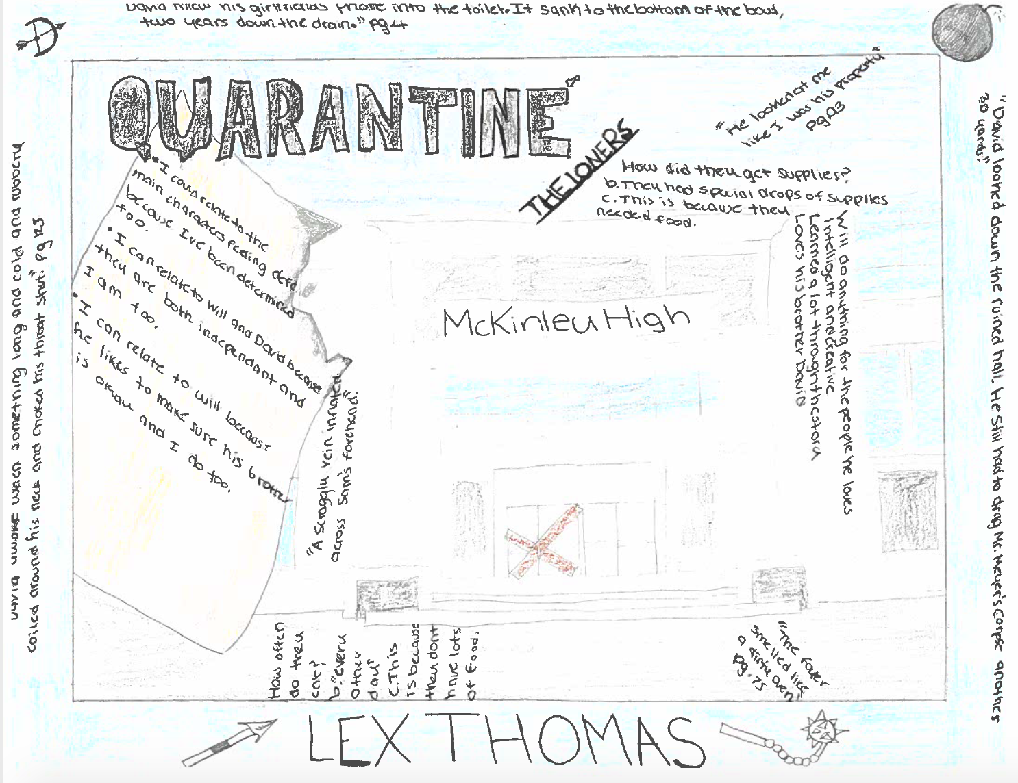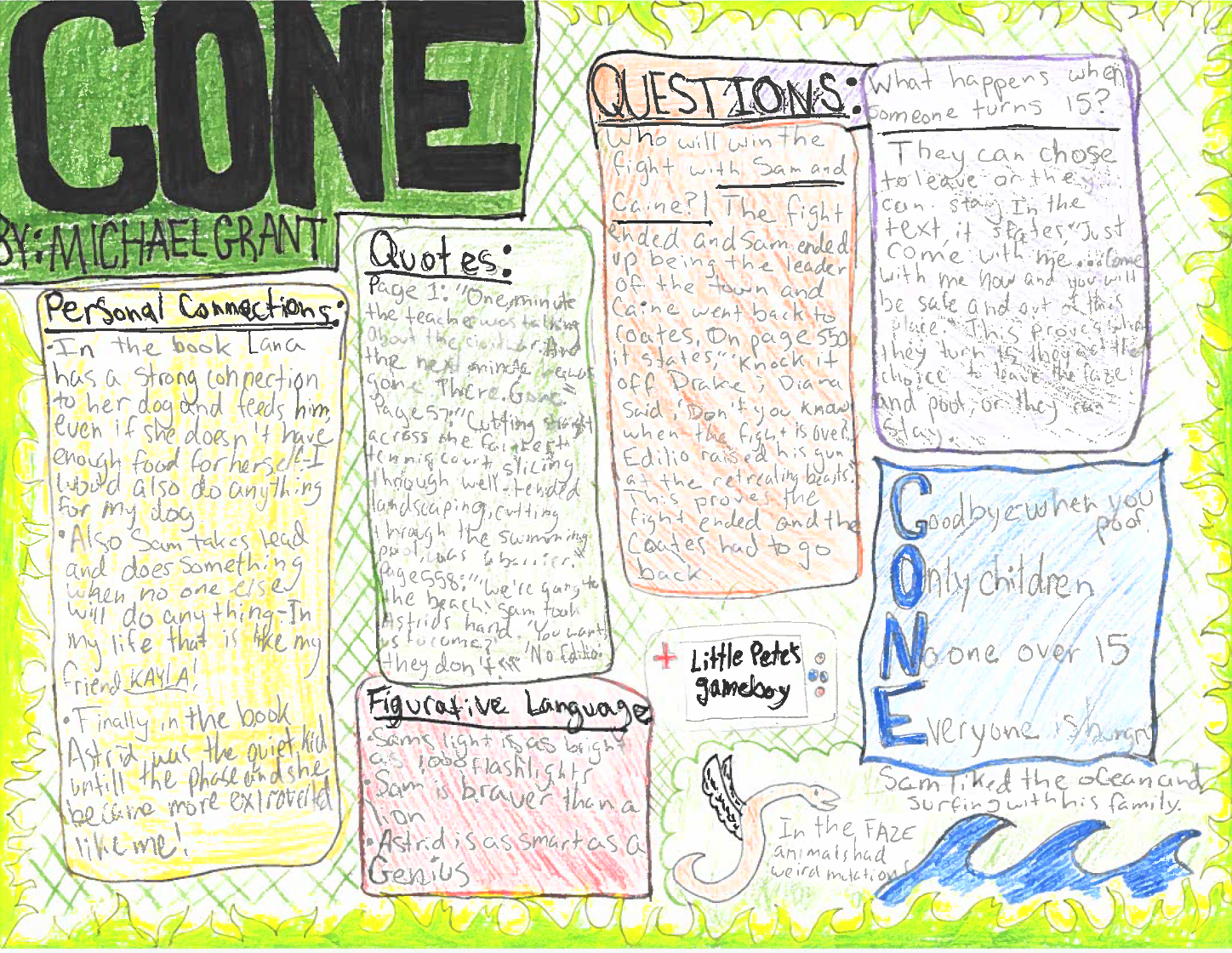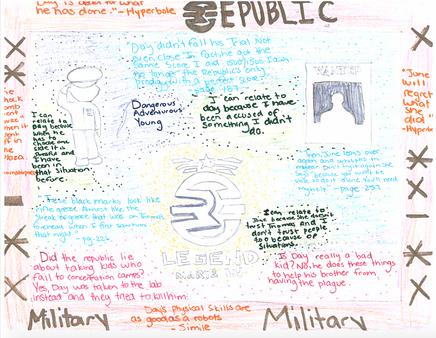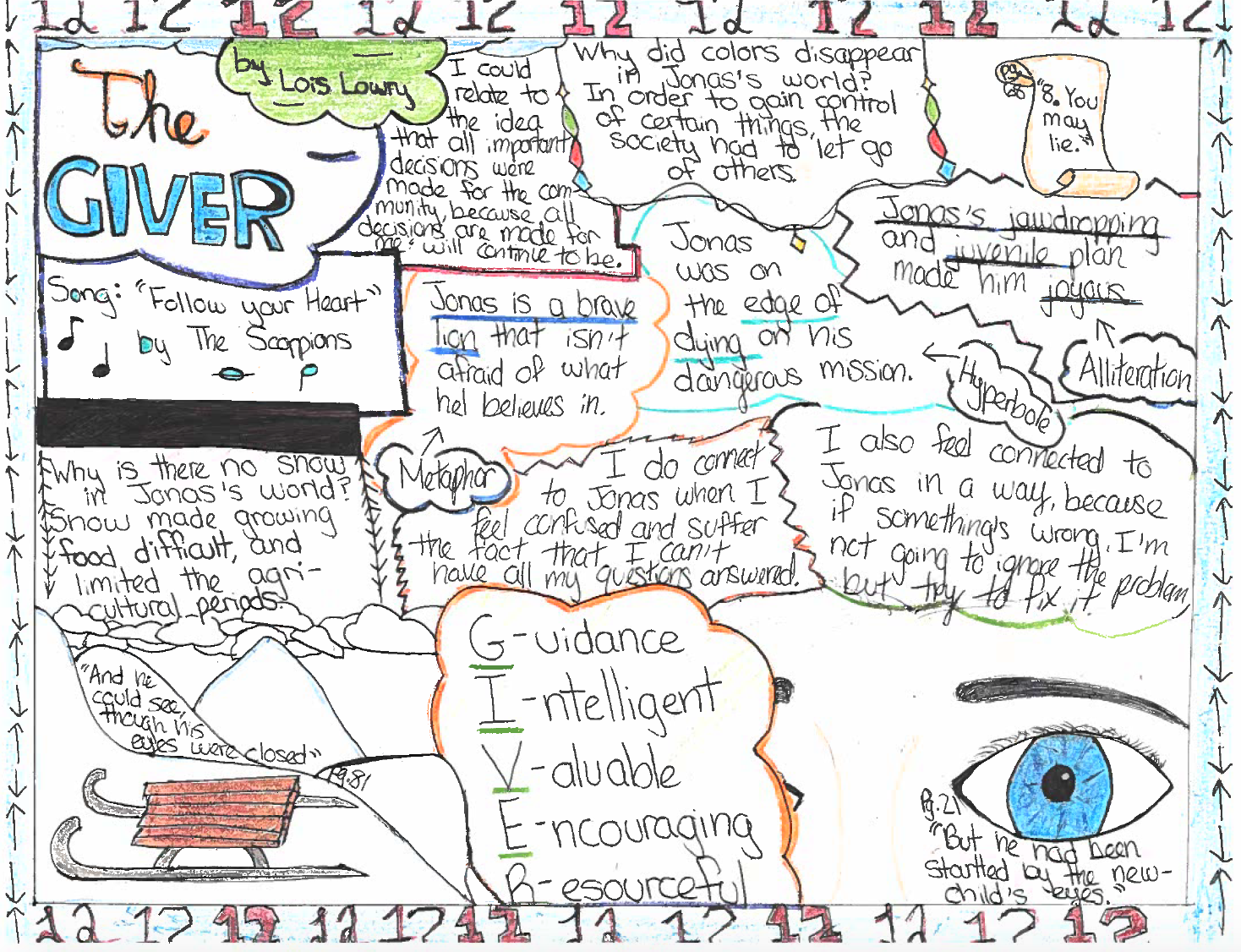 While looking for different ways to incorporate thinking about reading without writing the dreaded TDA essay, I was reminded of the one pager by Theresa who used them last year now and again (I didn’t make the connection last year) and was planning to do something similar for the dystopian book clubs. Theresa has seen a lot of engagement around this work and generously shared her work.