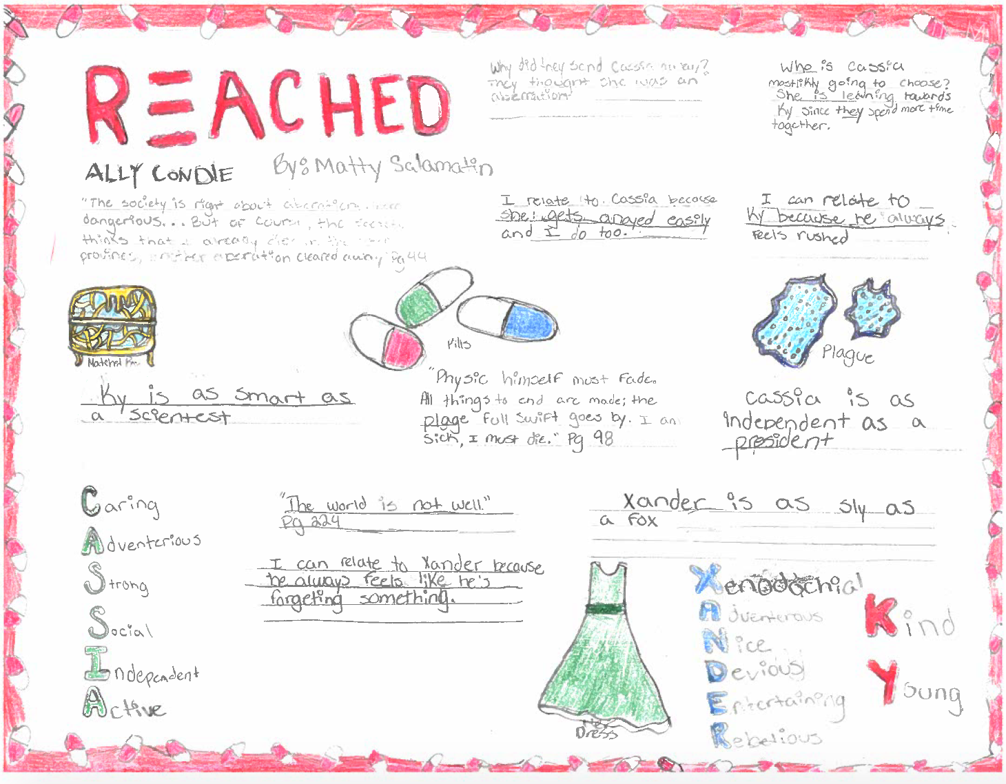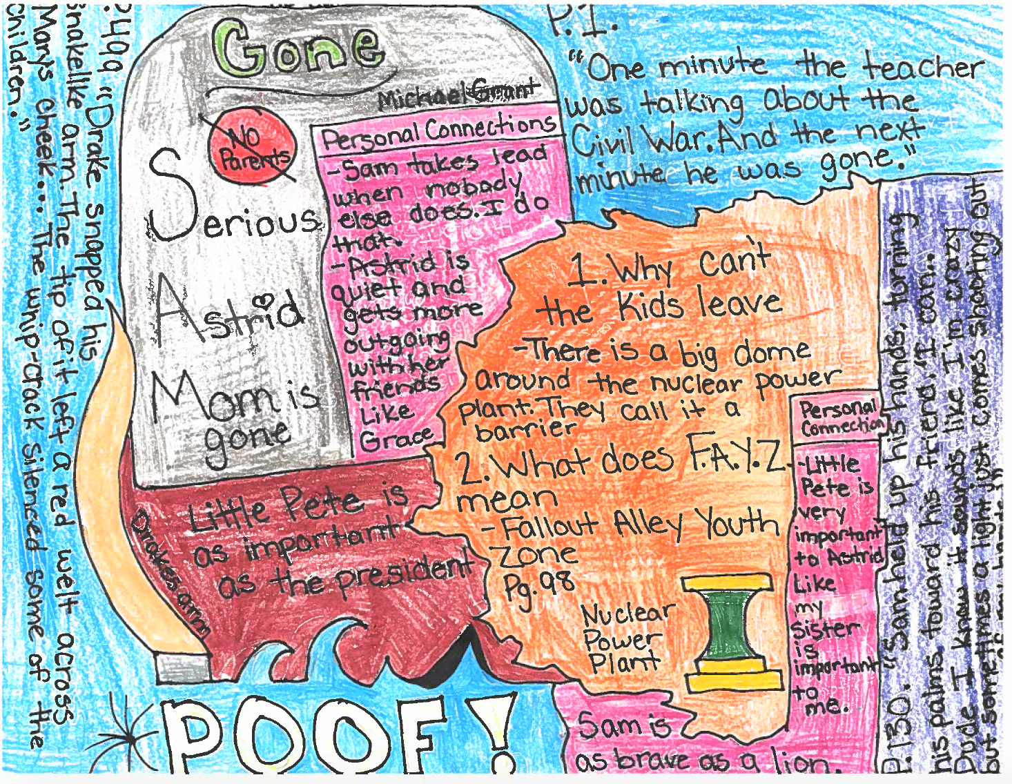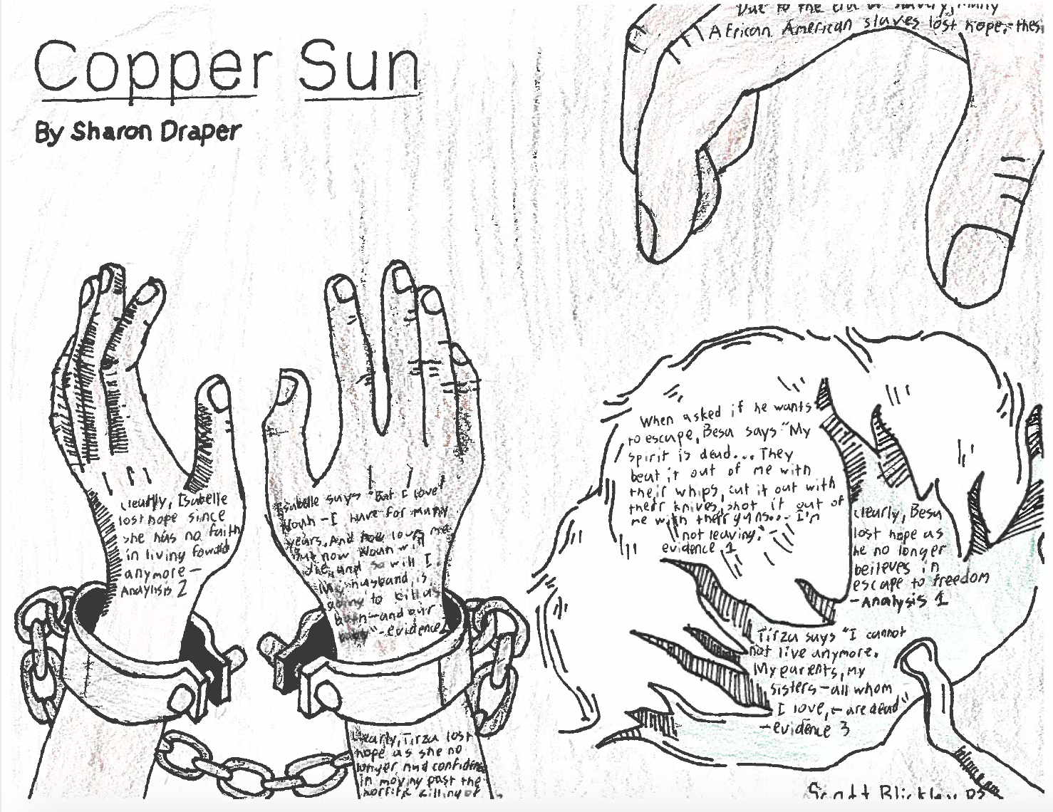 While looking for different ways to incorporate thinking about reading without writing the dreaded TDA essay, I was reminded of the one pager by Theresa who used them last year now and again (I didn’t make the connection last year) and was planning to do something similar for the dystopian book clubs. Theresa has seen a lot of engagement around this work and generously shared her work.